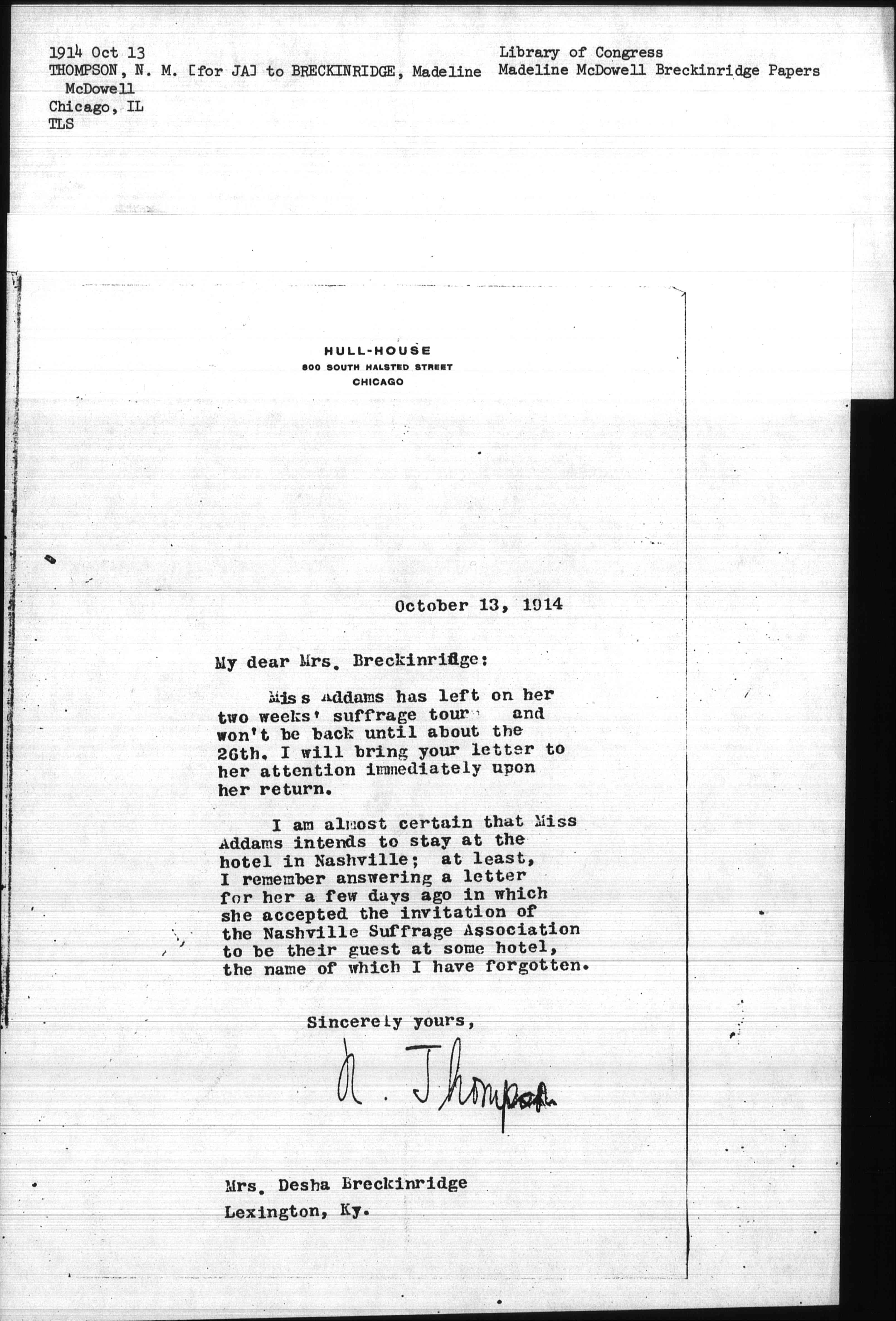 I am almost certain that Miss Addams intends to stay at the hotel in Nashville; at least, I remember answering a letter for her a few days ago in which she accepted the invitation of the Nashville Suffrage Association to be their guest at some hotel, the name of which I have forgotten.