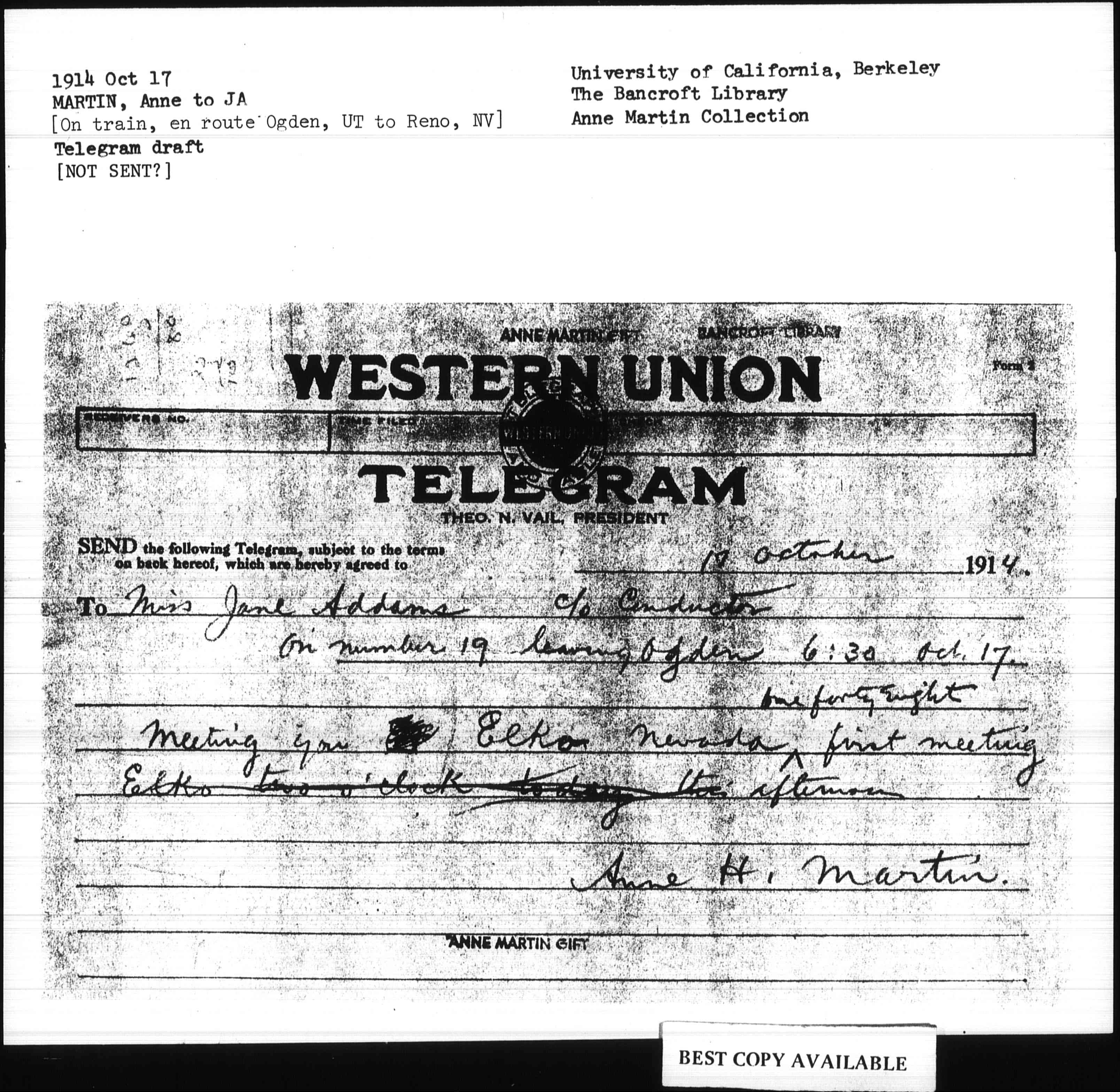 To Miss Jane Addams c/o Conductor on number 19 leaving Ogden 6:30 Oct. 17.