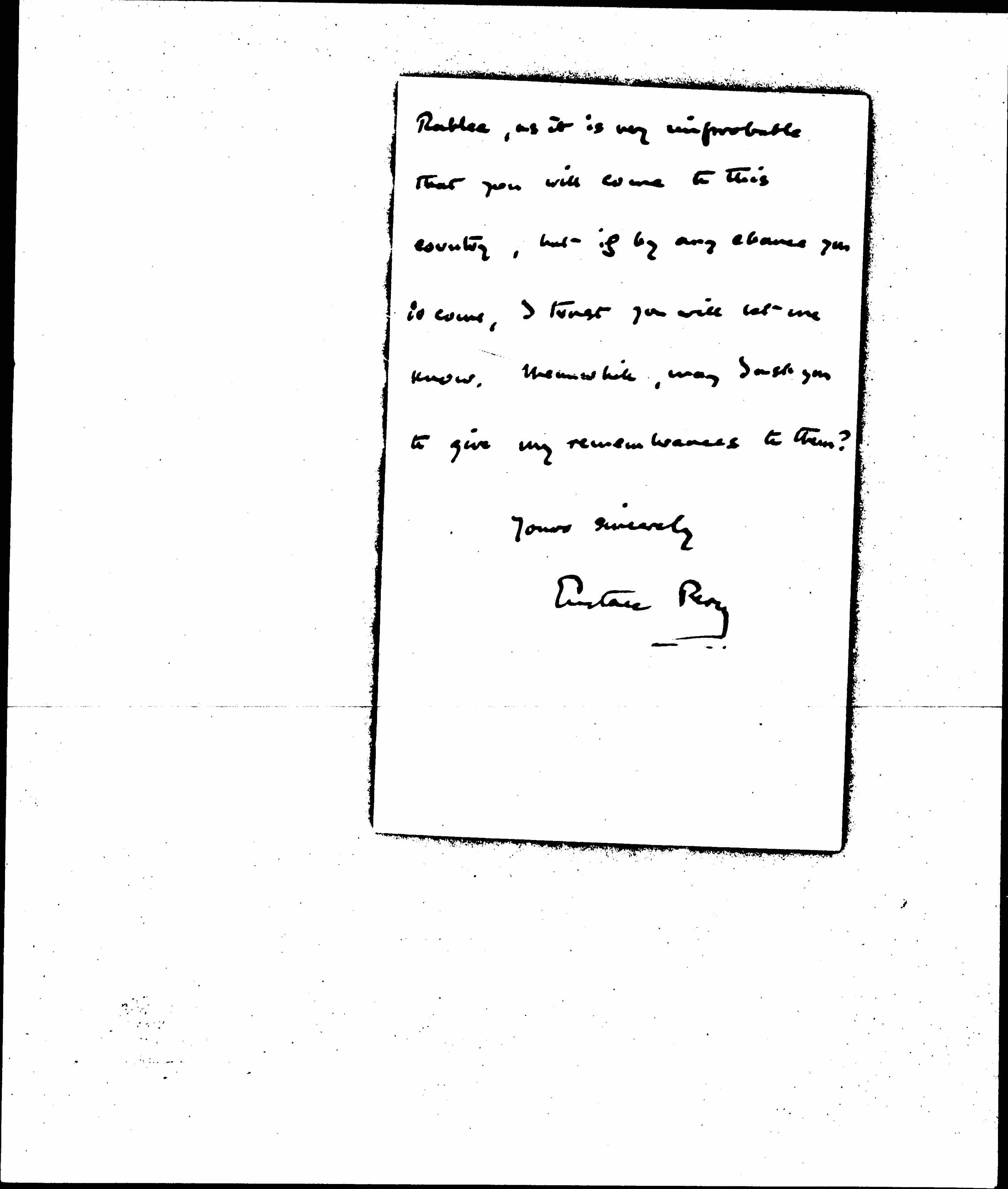 I fear I cannot hope to see you or Miss Hamilton or Mrs [page 3] Rublee, as it is very improbable that you will come to this country, but if by any chance you [do] come, I trust you will let me know. Meanwhile, may I ask you to give my remembrances to them?