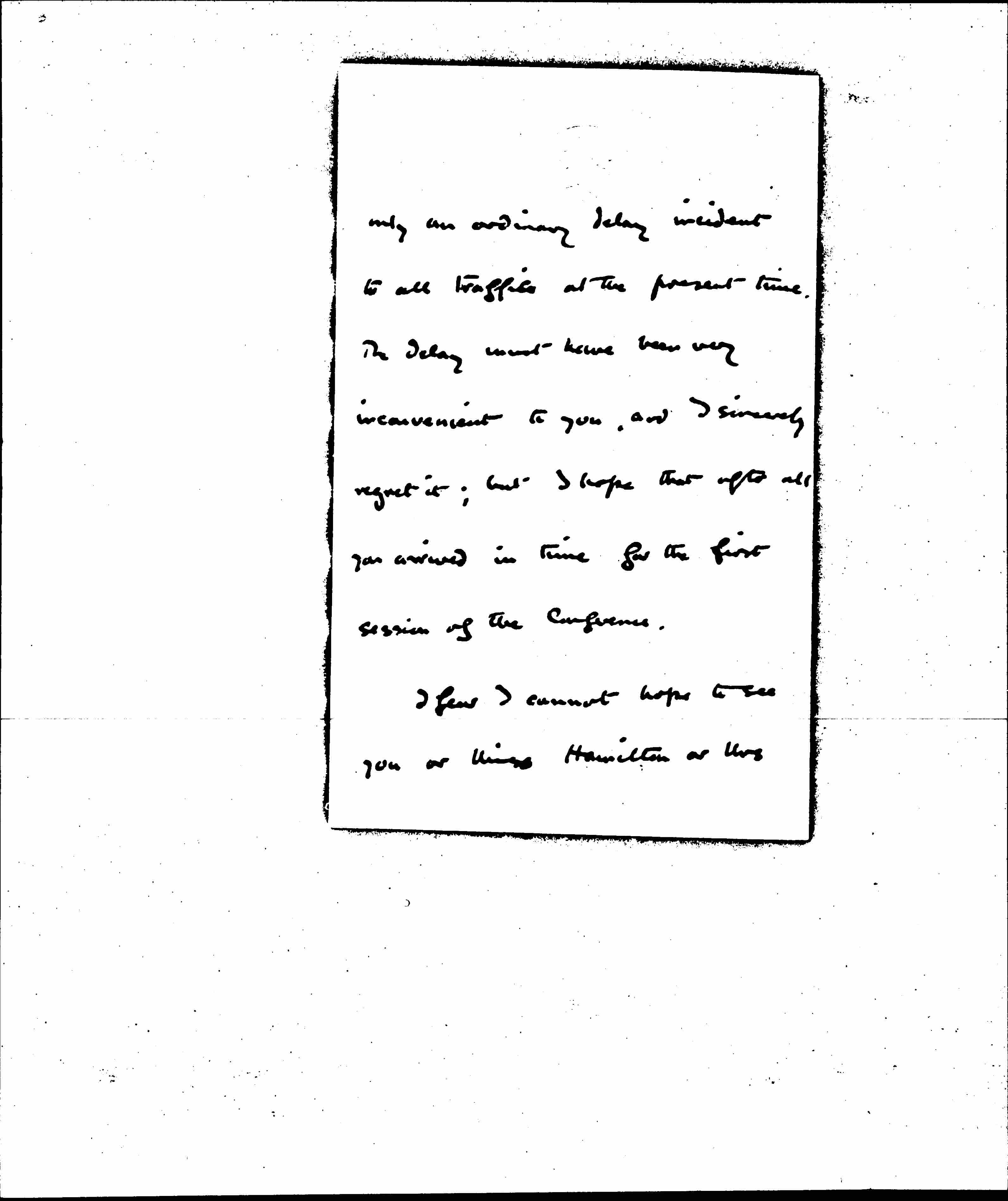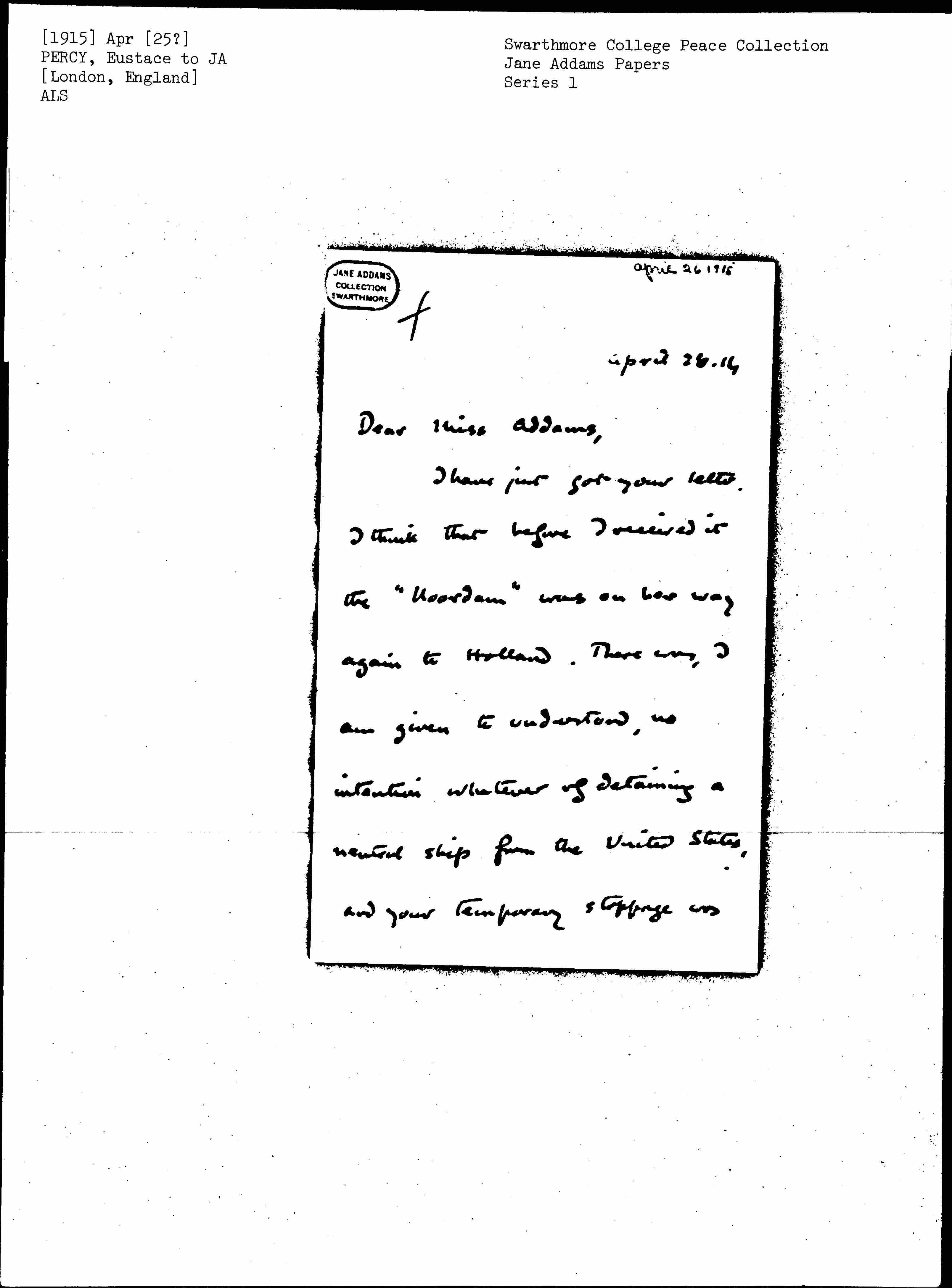 I have just got your letter. I think that before I received it the "Noordam" was on her way again to Holland. There was, I was given to understand, no intention whatever of detaining a neutral ship from the United States, and your temporary stoppage was [page 2] only an ordinary delay incident to all traffic at the present time. The delay must have been very inconvenient to you, and I sincerely regret it; but I hope that after all you arrived in time for the first session of the Conference.