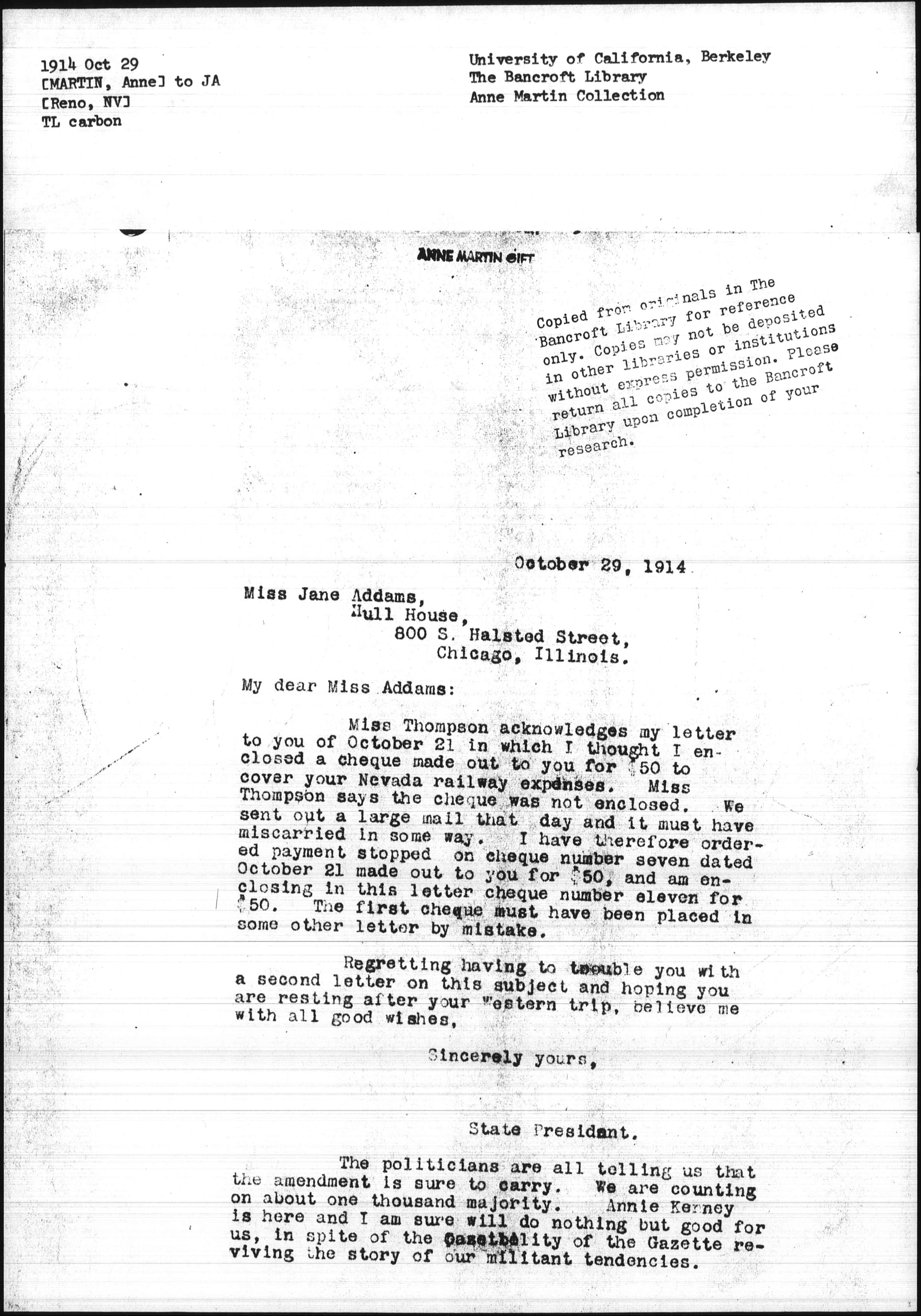 Miss Thompson acknowledges my letter to you of October 21 in which I thought I enclosed a [check] made out to you for $50 to cover your Nevada railway expenses. Miss Thompson says the [check] was not enclosed. We sent out a large mail that day and it must have miscarried in some way. I have therefore ordered payment stopped on [check] number seven dated October 21 made out to you for $50, and am enclosing in this letter [check] number eleven for $50. The first [check] must have been placed in some other letter by mistake.