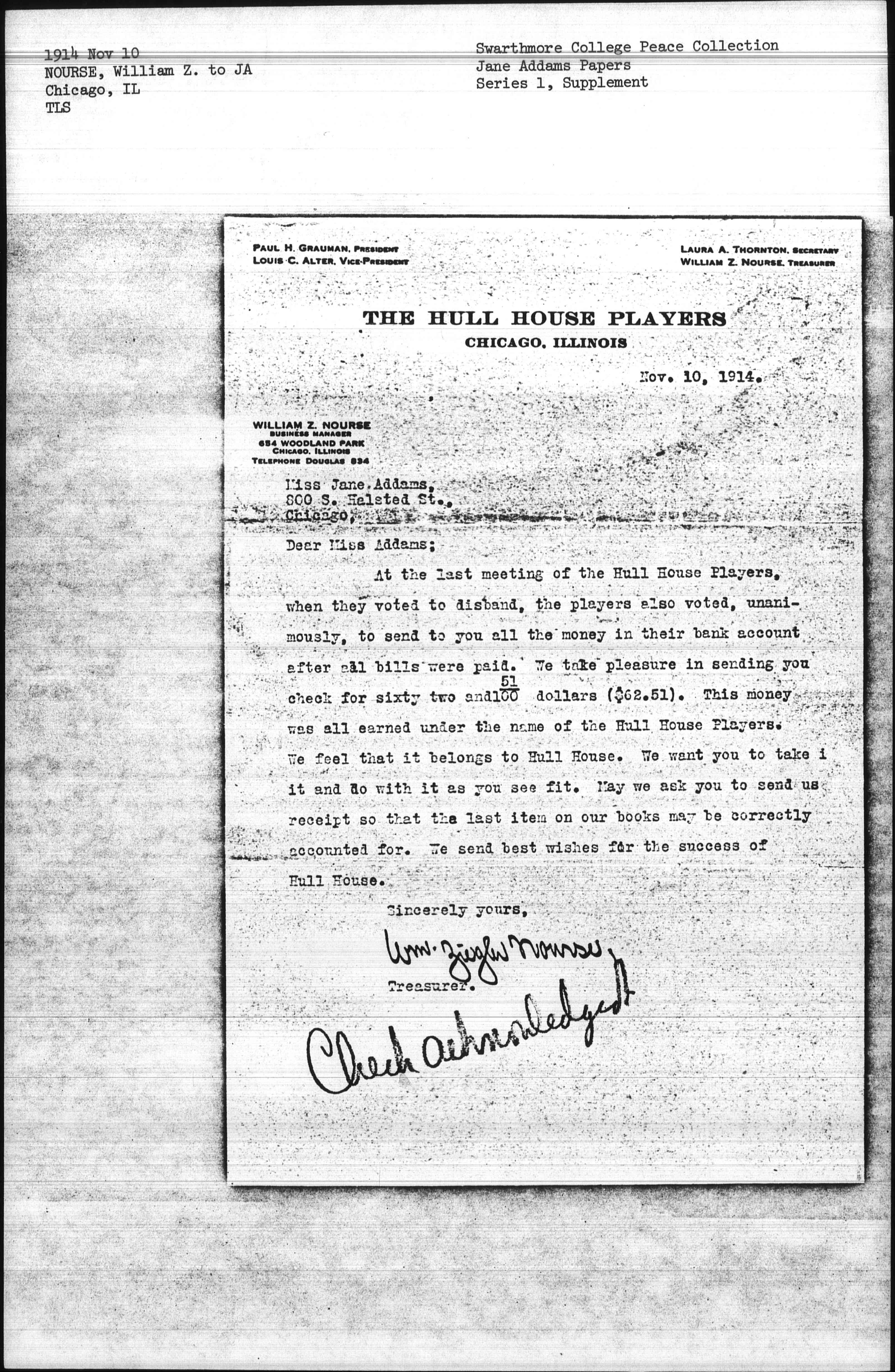 At the last meeting of the Hull House Players, when they voted to disband, the players also voted, unanimously, to send to you all the money in their bank account after all bills were paid. We take pleasure in sending you check for sixty-two and 51/100 dollars ($62.51). This money was all earned under the name of the Hull House Players. We feel that it belongs to Hull House. We want you to take it and do with it as you see fit. May we ask you to send us receipt so that the last item on our books may be correctly accounted for. We send best wishes for the success of Hull House.