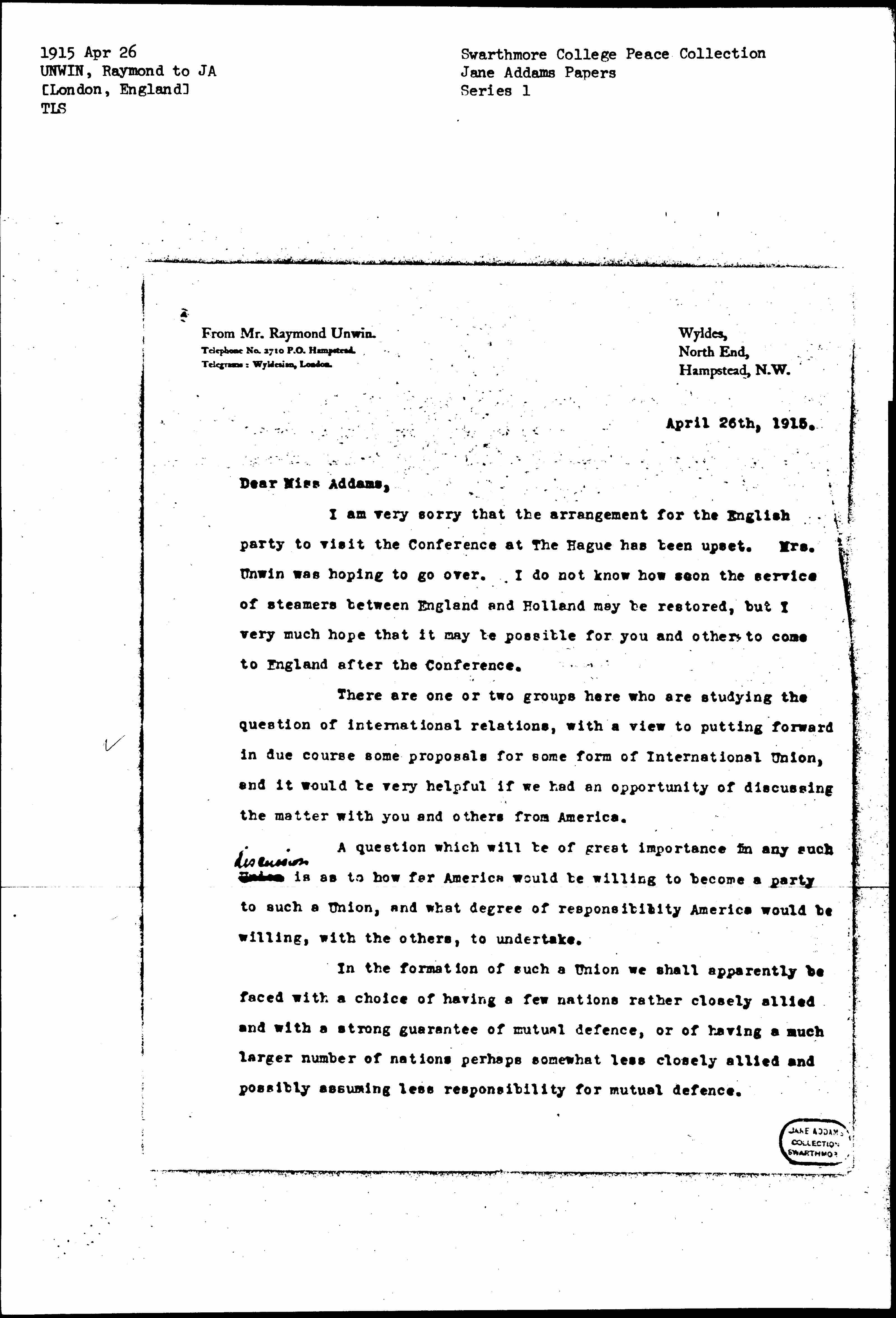 I am very sorry that the arrangement for the English party to visit the Conference at The Hague has been upset. Mrs. Unwin was hoping to go over. I do not know how soon the service of steamers between England and Holland may be restored, but I very much hope that it may be possible for you and others to come to England after the Conference.