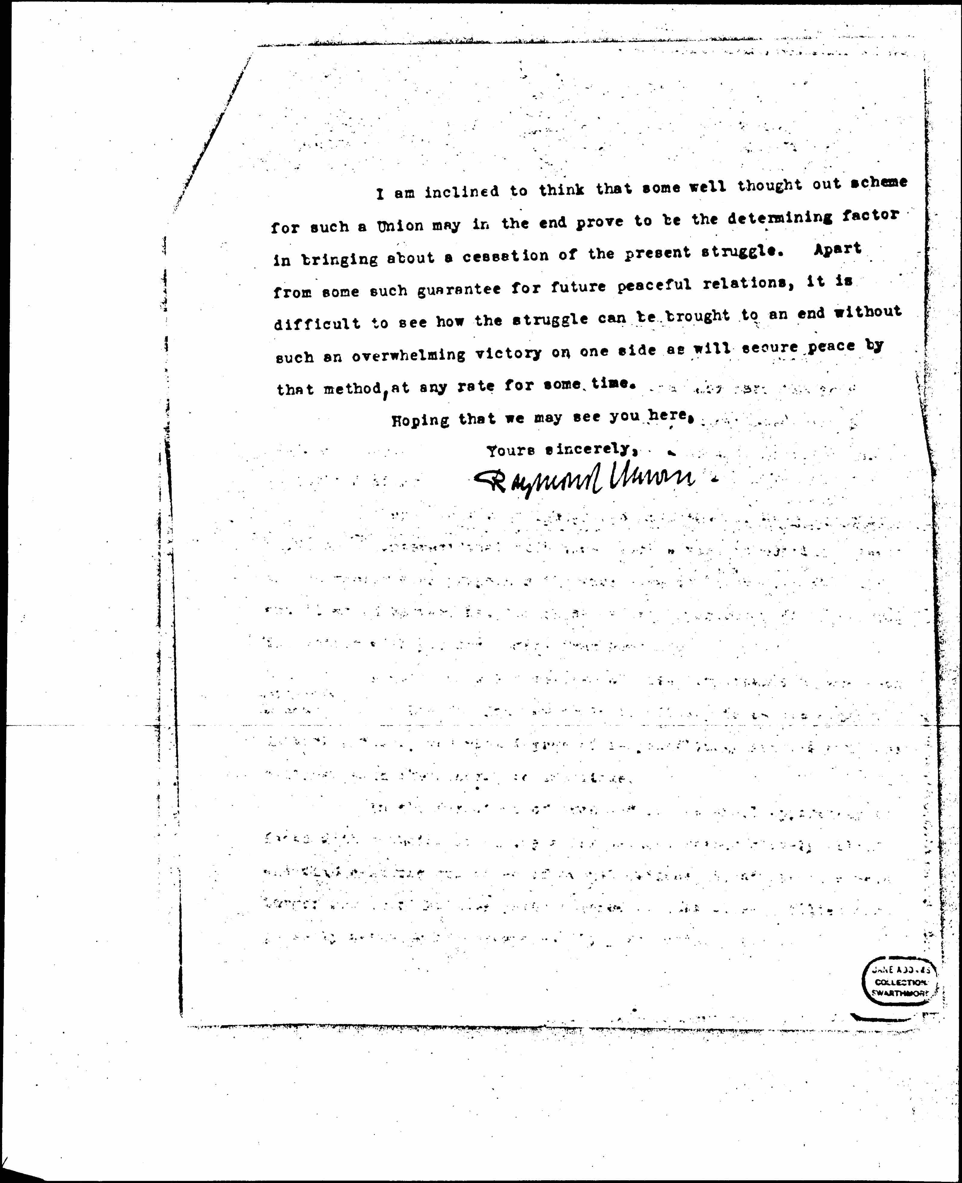 I am inclined to think that some well thought out scheme for such a Union may in the end prove to be the determining factor in bringing about a cessation of the present struggle. Apart from some such guarantee for future peaceful relations, it is difficult to see how the struggle can be brought to an end without such an overwhelming victory on one side as will secure peace by that method, at any rate for some time.