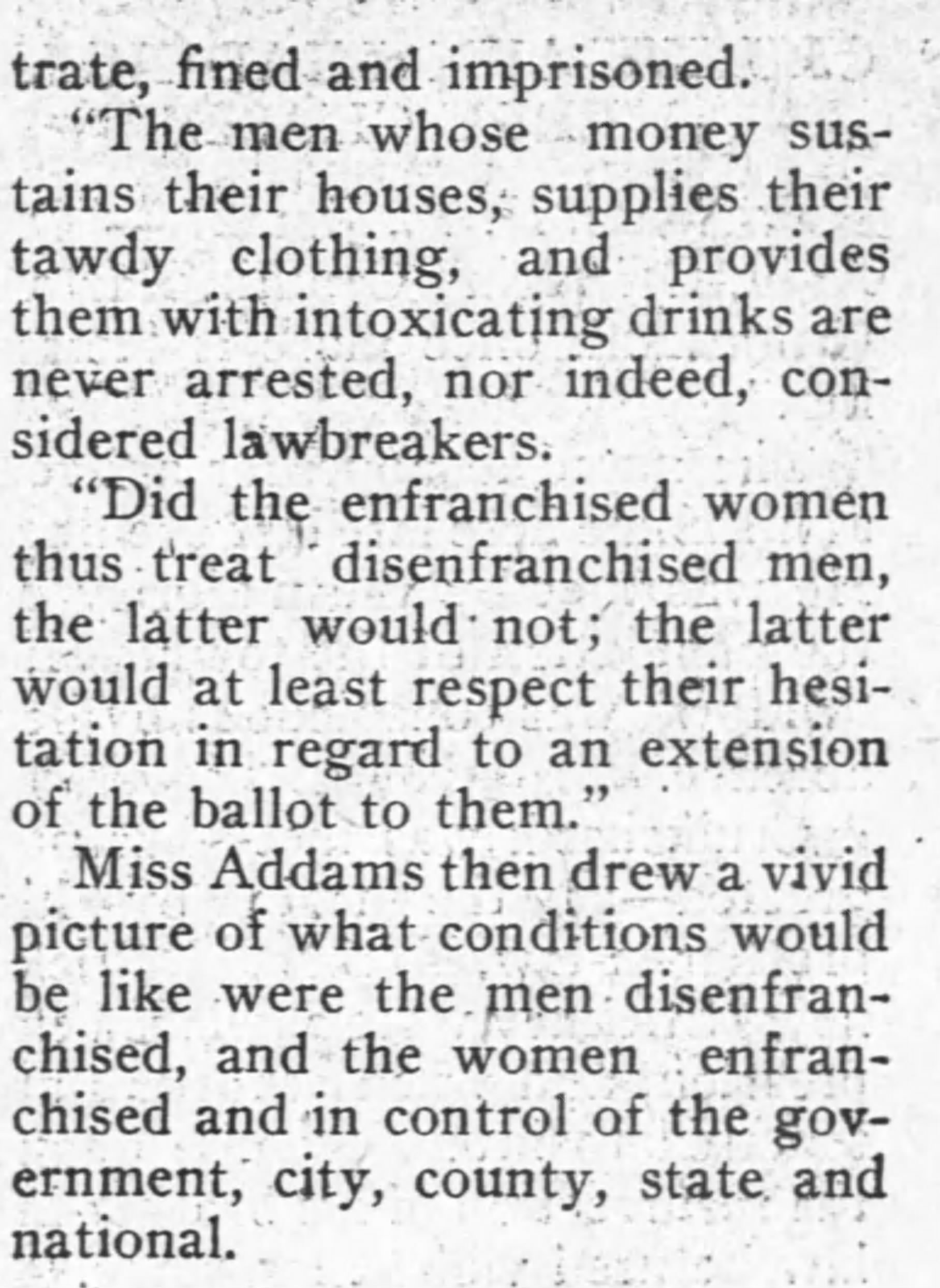 Miss Addams then drew a vivid picture of what conditions would be like were the men disenfranchised, and the women enfranchised and in control of the government, city, county, state and national.