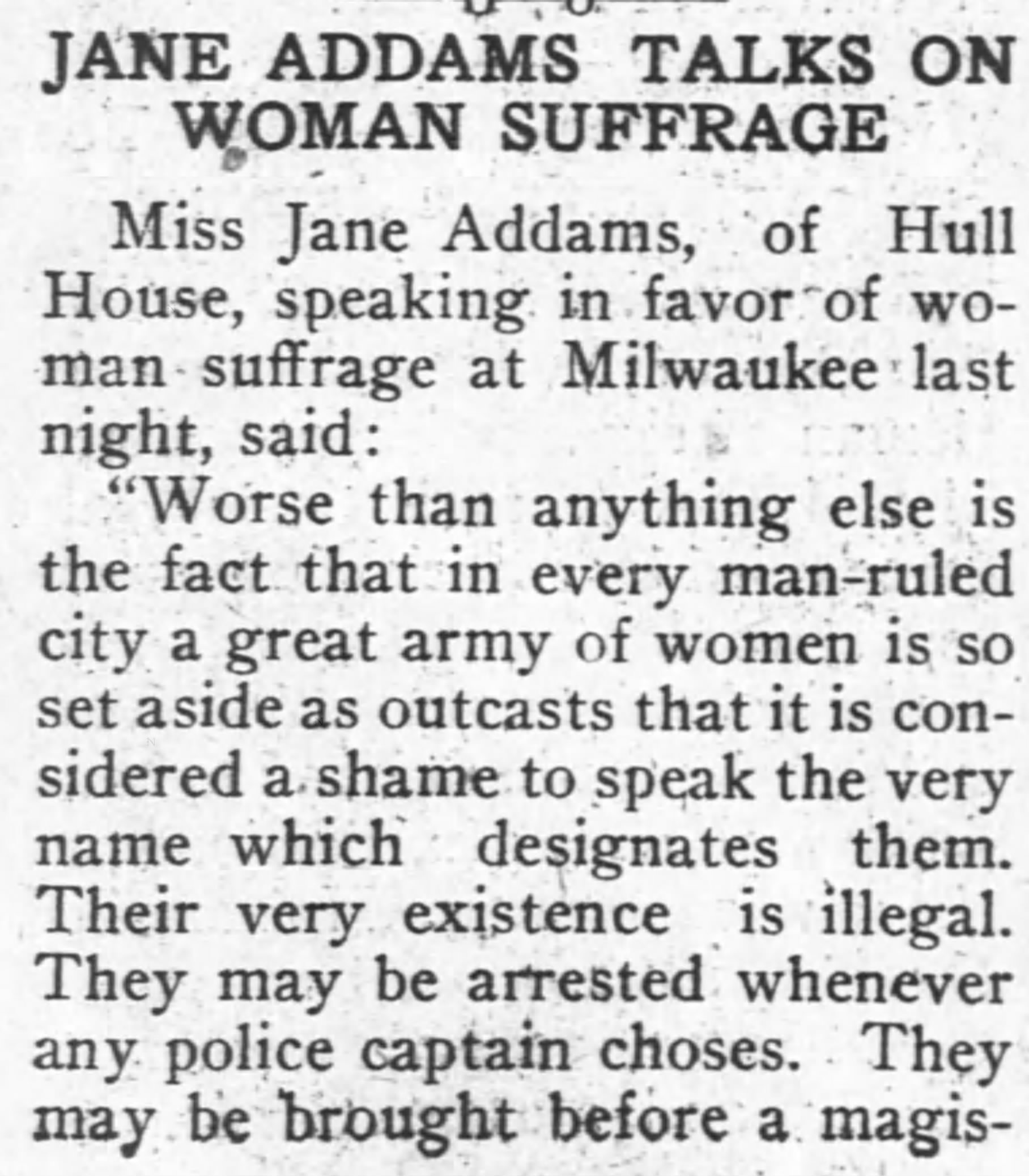 Miss Jane Addams, of Hull House, speaking in favor of woman suffrage at Milwaukee last night, said: