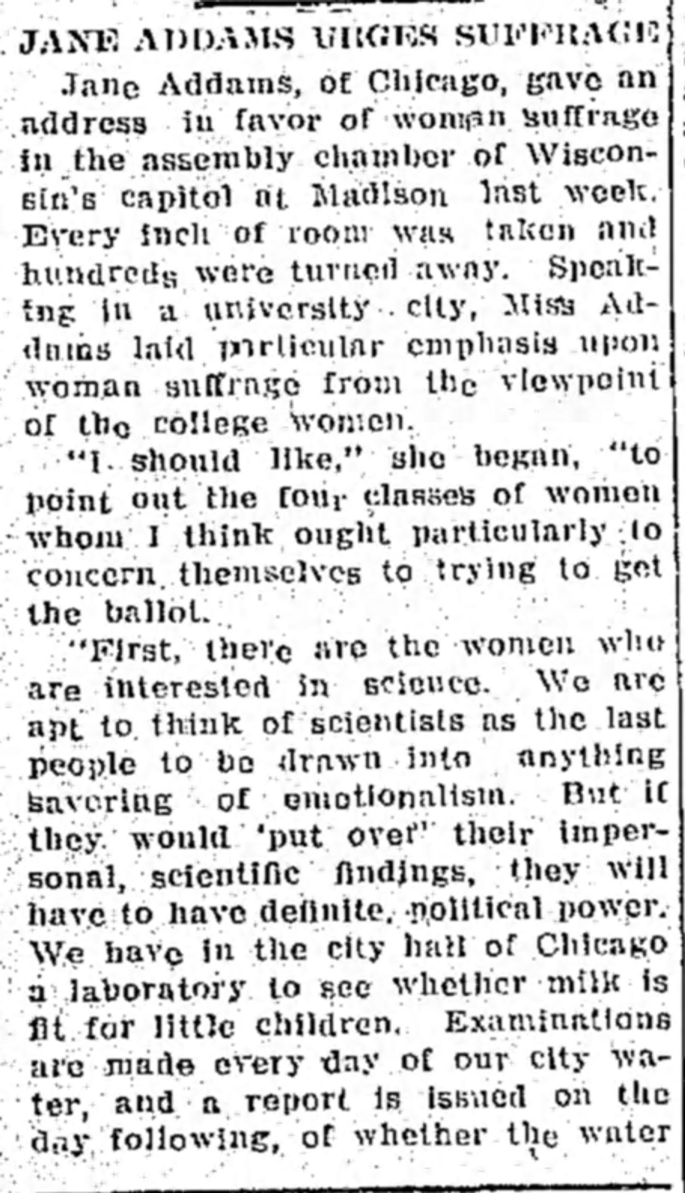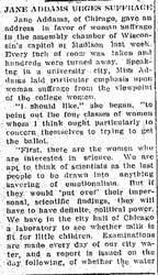 Jane Addams, of Chicago, gave an address in favor of woman suffrage in the assembly chamber of Wisconsin's capitol at Madison last week. Every inch of room was taken and hundreds were turned away. Speaking in a university city, Miss Addams laid particular emphasis upon woman suffrage from the viewpoint of the college women.