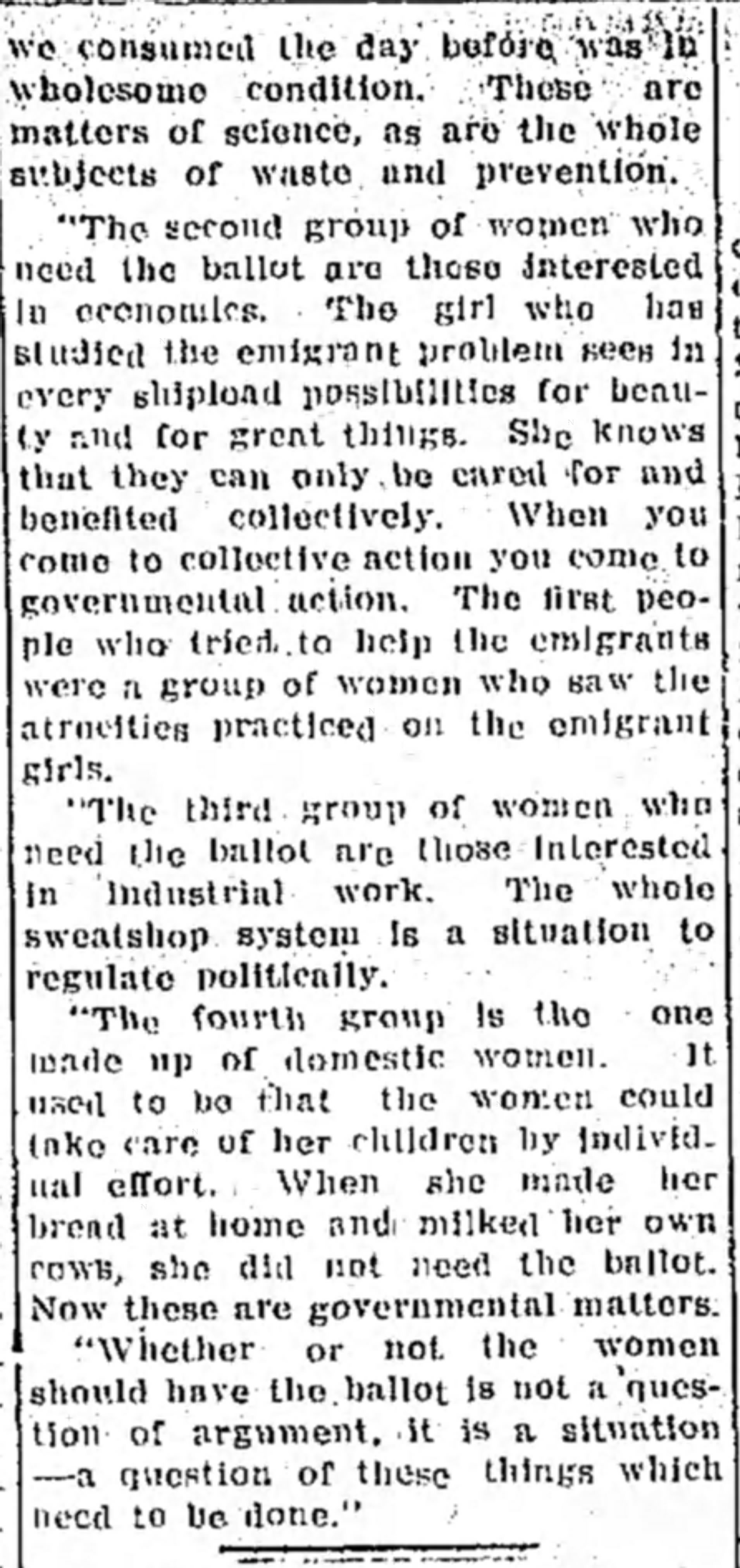 "The second group of women who need the ballot are those interested in economics. The girl who has studied the emigrant problem sees in every shipload possibilities for beauty and for great things. She knows that they can only be cared for and benefited collectively. When you come to collective action you come to governmental action. The first people who tried to help the emigrants were a group of women who saw the atrocities practiced on the emigrant girls.