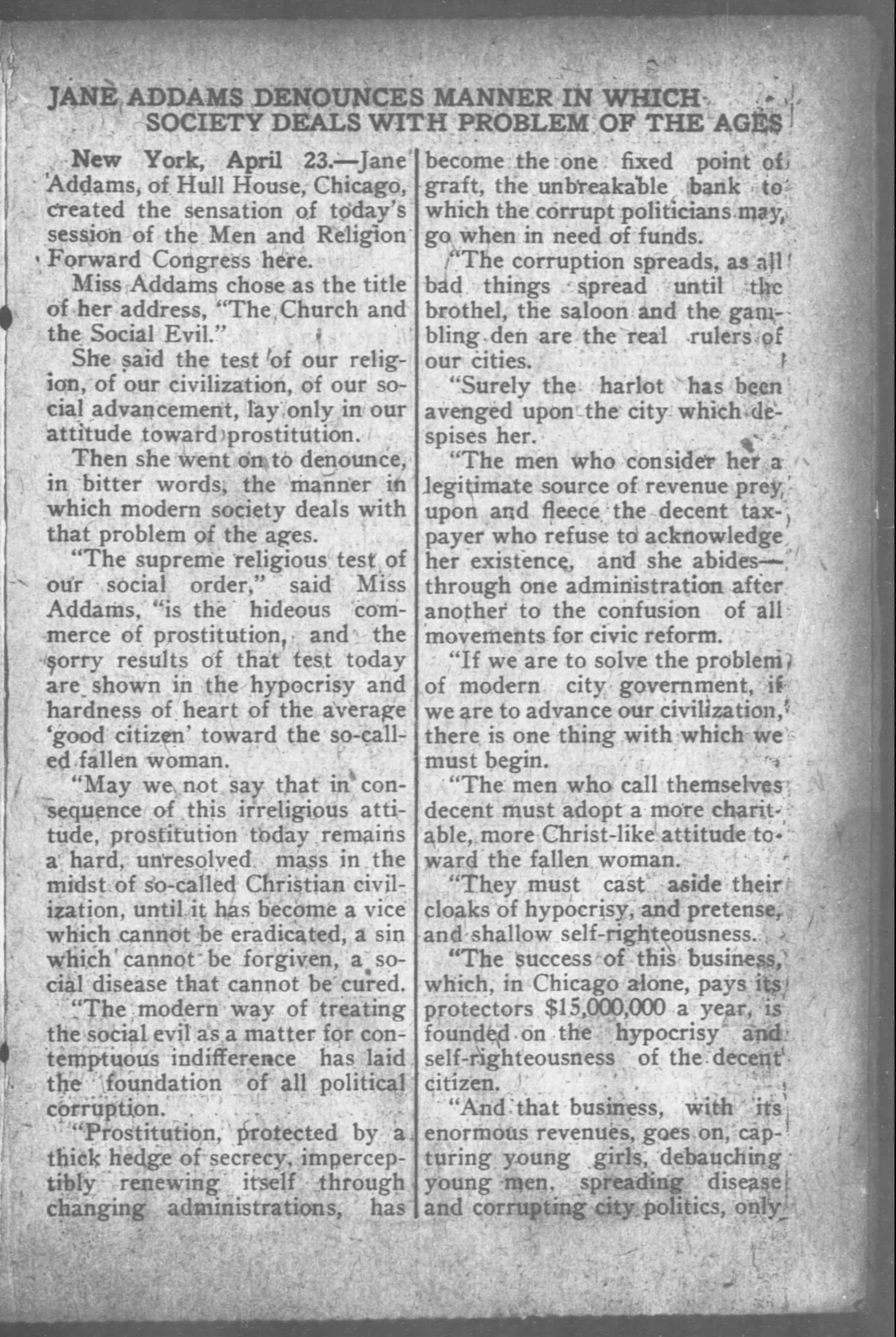 "The supreme religious test of our social order," said Miss Addams, "is the hideous commerce of prostitution, and the sorry results of that test today are shown in the hypocrisy and hardness of heart of the average 'good citizen' toward the so-called fallen woman.