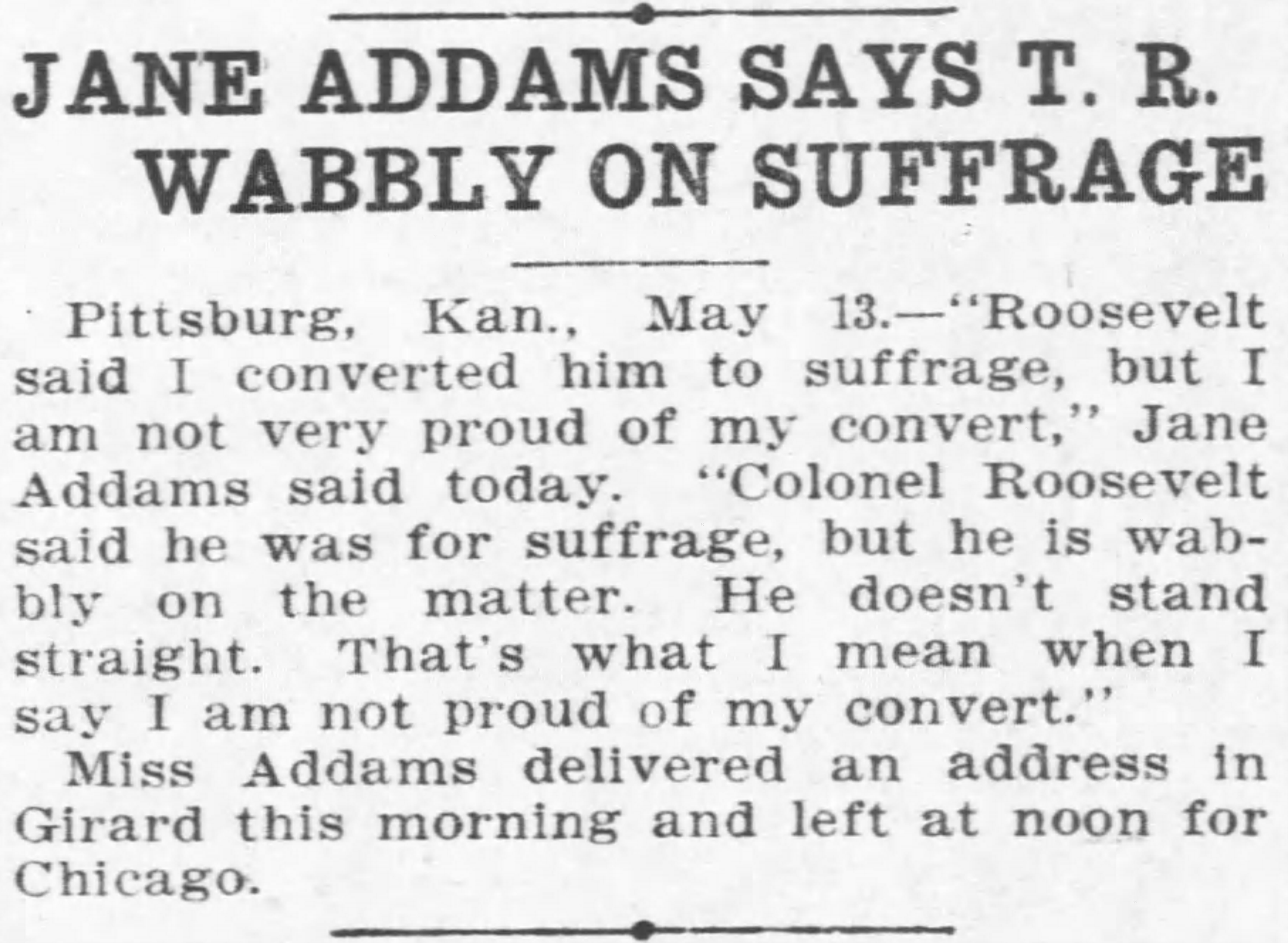 Pittsburg, Kan., May 13. -- "Roosevelt said I converted him to suffrage, but I am not very proud of my convert," Jane Addams said today. "Colonel Roosevelt said he was for suffrage, but he is wabbly on the matter. He doesn't stand straight. That's what I mean when I say I am not proud of my convert."