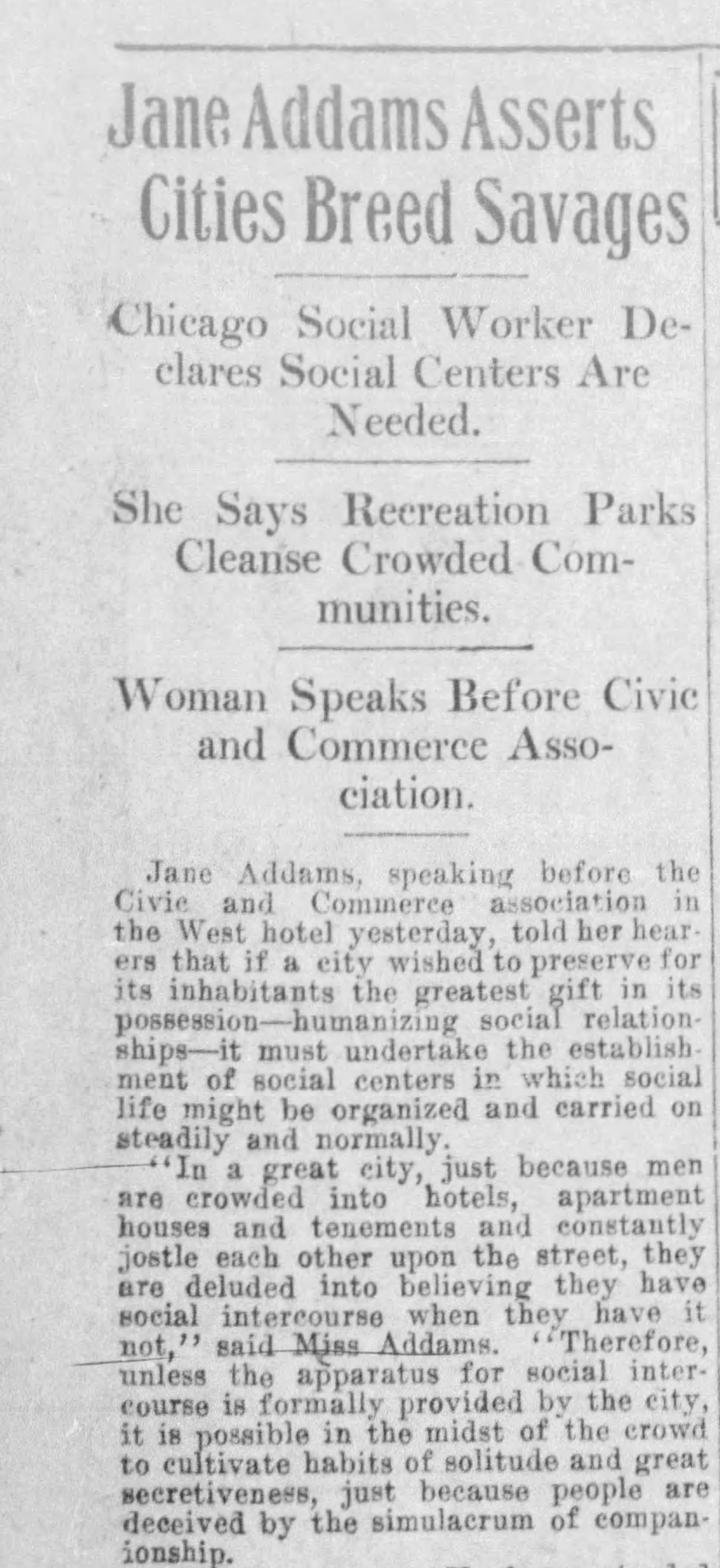 "In a great city, just because men are crowded into hotels, apartment houses and tenements and constantly jostle each other upon the street, they are deluded into believing they have social intercourse when they have it not," said Miss Addams. "Therefore, unless the apparatus for social intercourse is formally provided by the city, it is possible in the midst of the crowd to cultivate habits of solitude and great secretiveness, just because people are deceived by the simulacrum of companionship.