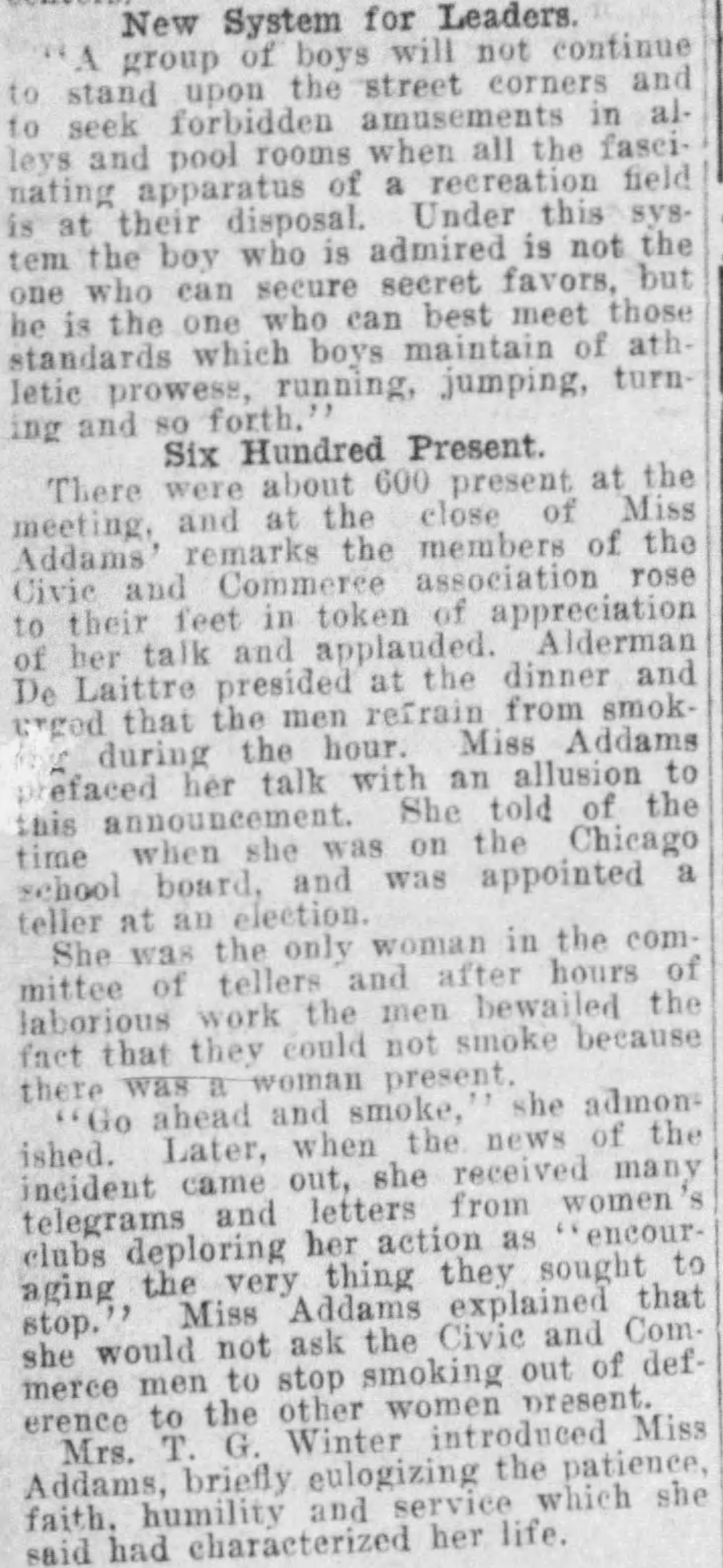 There were about 600 present at the meeting, at the close of Miss Addams' remarks the members of the Civic and Commerce association rose to their feet in token of appreciation of her talk and applauded. Alderman De Laittre presided at the dinner and urged that the men refrain from smoking during the hour. Miss Addams prefaced her talk with an allusion to this announcement. She told of the time when she was on the Chicago school board, and was appointed a teller at an election.