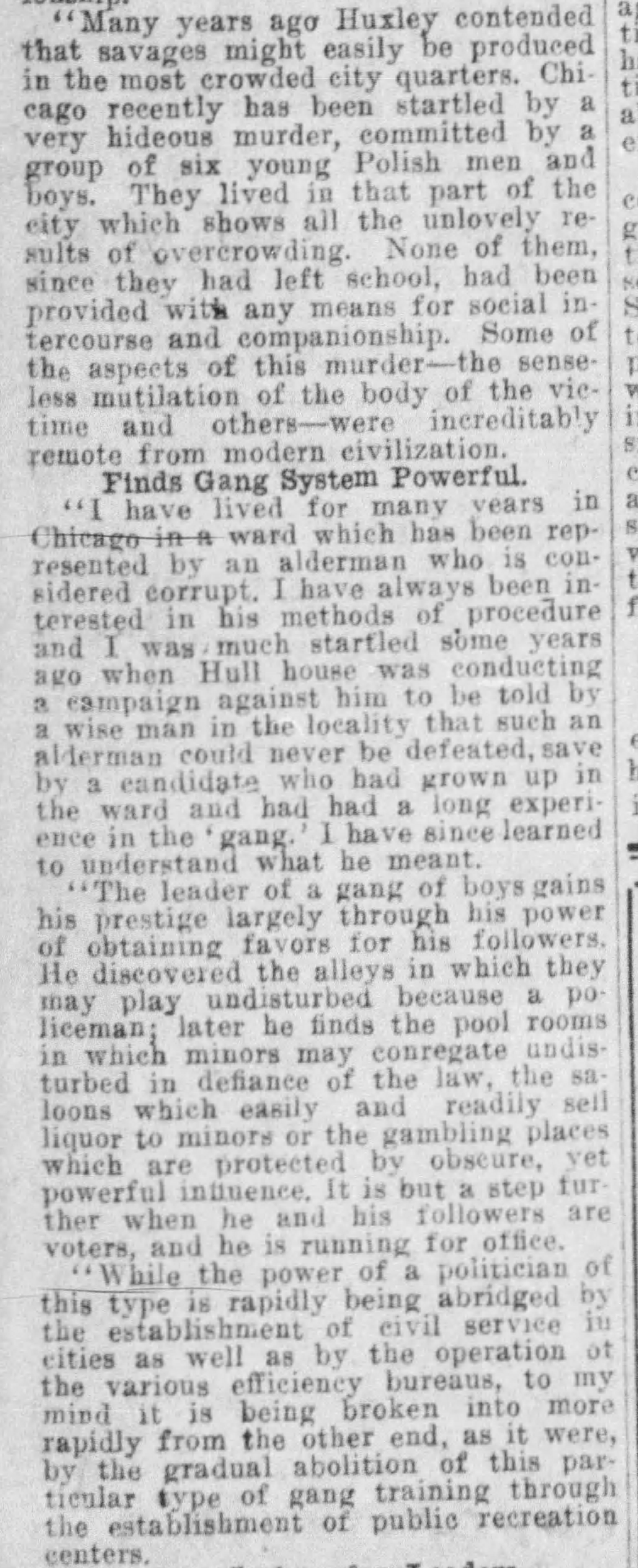 [Page 2] "Many years ago Huxley contended that savages might easily be produced in the most crowded city quarters. Chicago recently has been startled by a very hideous murder, committed by a group of six young Polish men and boys. They lived in that part of the city which shows all the unlovely results of overcrowding. None of them, since they had left school, had been provided with any means for social intercourse and companionship. Some of the aspects of this murder -- the senseless mutilation of the body of the [victim] and others -- were [incredibly] remote from modern civilization.