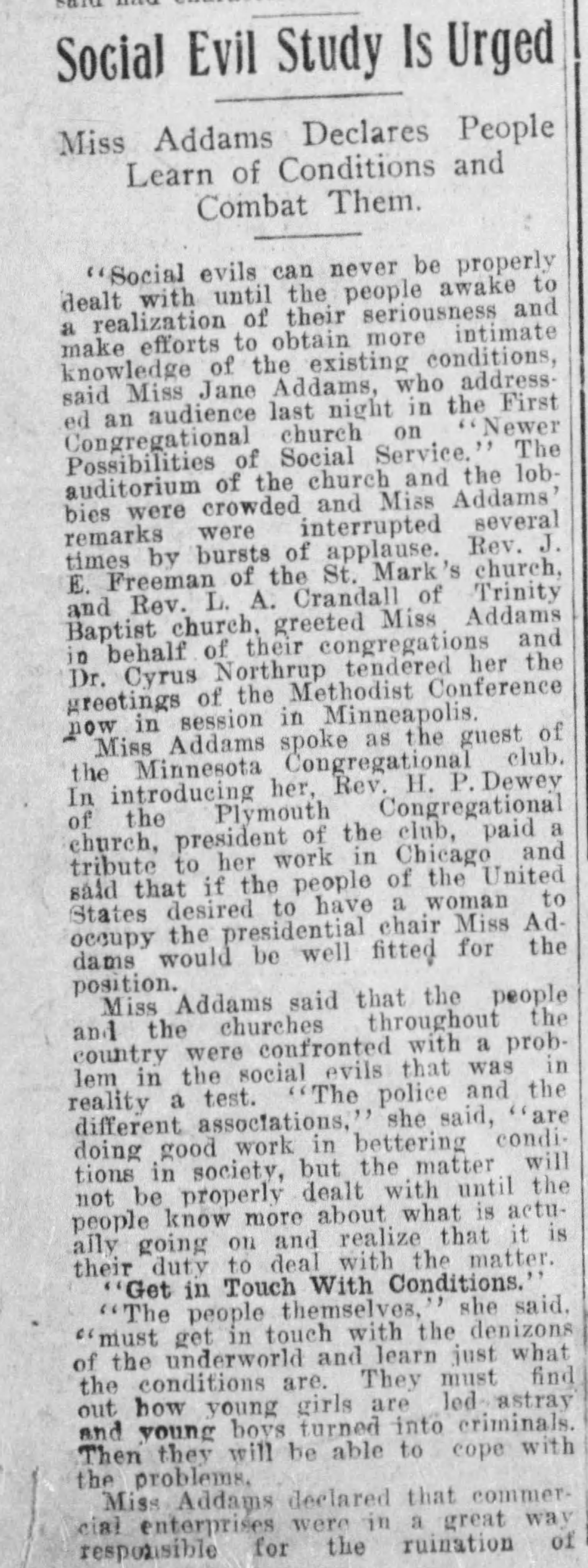 "Social evils can never be properly dealt with until the people awake to a realization of their seriousness and make efforts to obtain more intimate knowledge of the existing conditions, said Miss Jane Addams, who addressed an audience last night in the First Congregational church on "Newer Possibilities of Social Service." The auditorium of the church and the lobbies were crowded and Miss Addams' remarks were interrupted several times by bursts of applause. Rev. J. E. Freeman of the St. Mark's church, and Rev. L. A. Crandall of Trinity Baptist church, greeted Miss Addams in behalf of their congregations and Dr. Cyrus Northrup tendered her the greetings of the Methodist Conference now in session in Minneapolis.