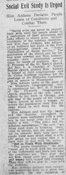 Miss Addams said that the people and the churches throughout the country were confronted with a problem in the social evils that was in reality a test. "The police and the different associations," she said, "are doing good work in bettering conditions in society, but the matter will not be properly dealt with until the people know more about what is actually going on and realize that it is their duty to deal with the matter.