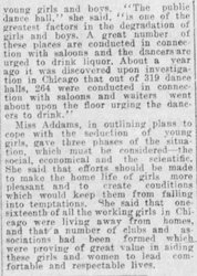 Miss Addams declared that commercial enterprises were in a great way responsible for the ruination of [Page 5] young girls and boys. "The public dance hall," she said, "is one of the greatest factors in the degradation of girls and boys. A great number of these places are conducted in connection with saloons and the dancers are urged to drink liquor. About a year ago it was discovered upon investigation in Chicago that out of 319 dance halls, 264 were conducted in connection with saloons and waiters went about upon the floor urging the dancers to drink."