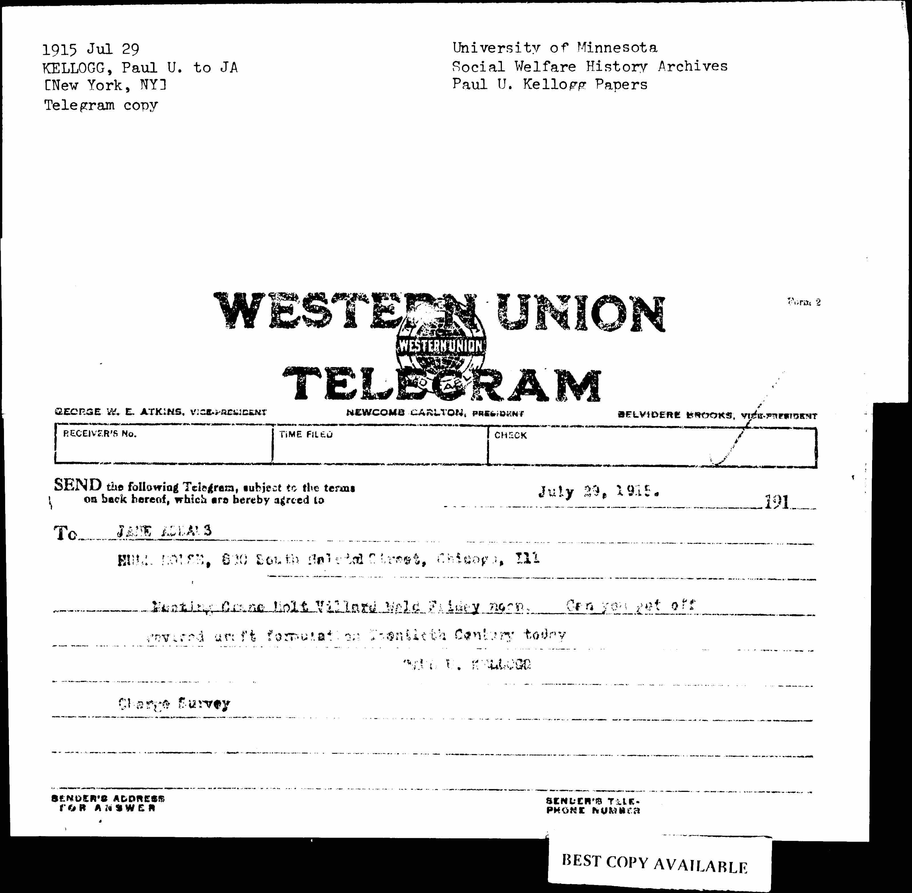 Meeting Crane Holt Villard Wald Friday noon. Can you get off revised draft formulation Twentieth Century today