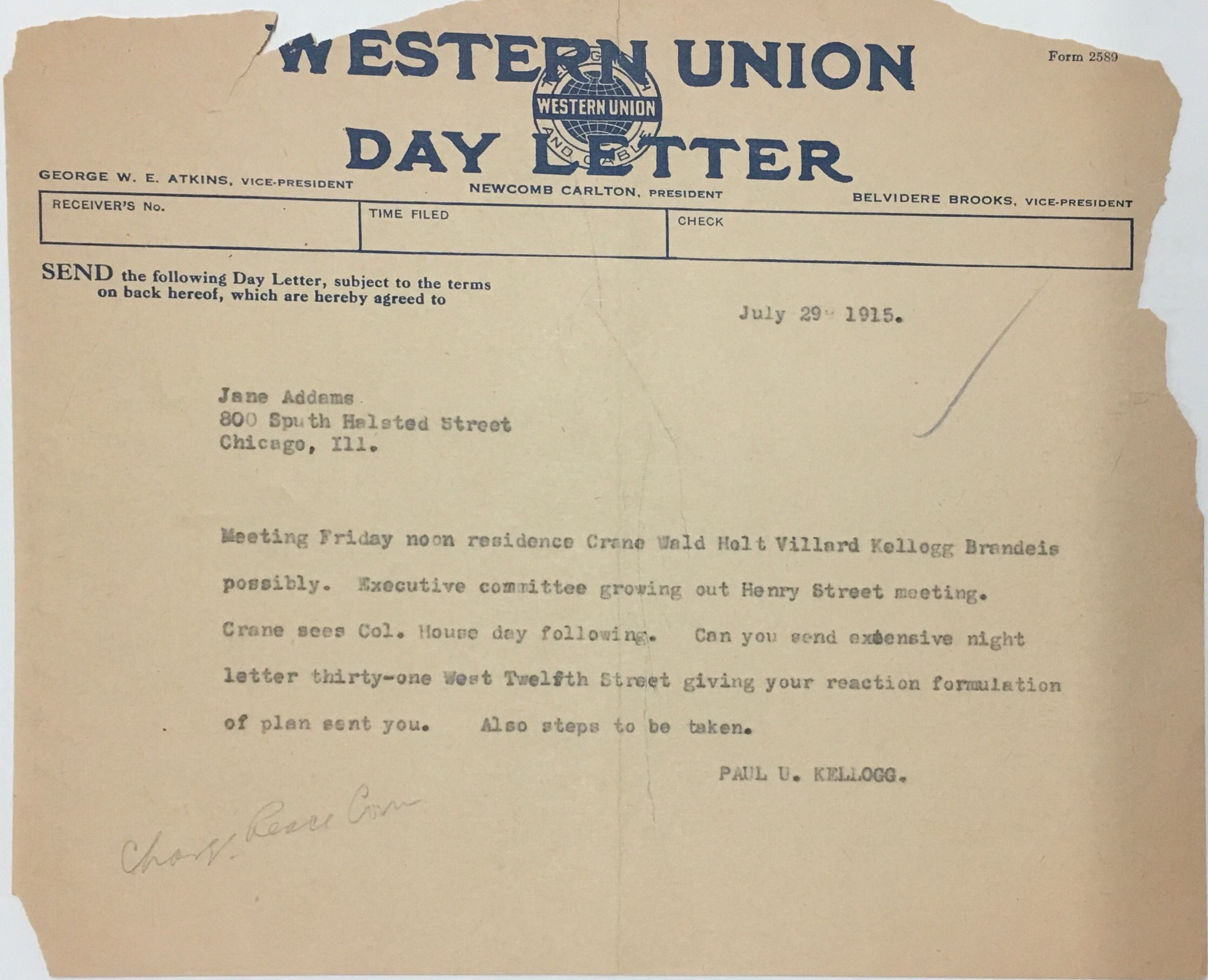 Meeting Friday noon residence Crane Wald Holt Villard Kellogg Brandeis possibly. Executive committee growing out Henry Street meeting. Crane sees Col. House day following. Can you send extensive night letter thirty-one West Twelfth Street giving your reaction formulation of plan sent you. Also steps to be taken.
