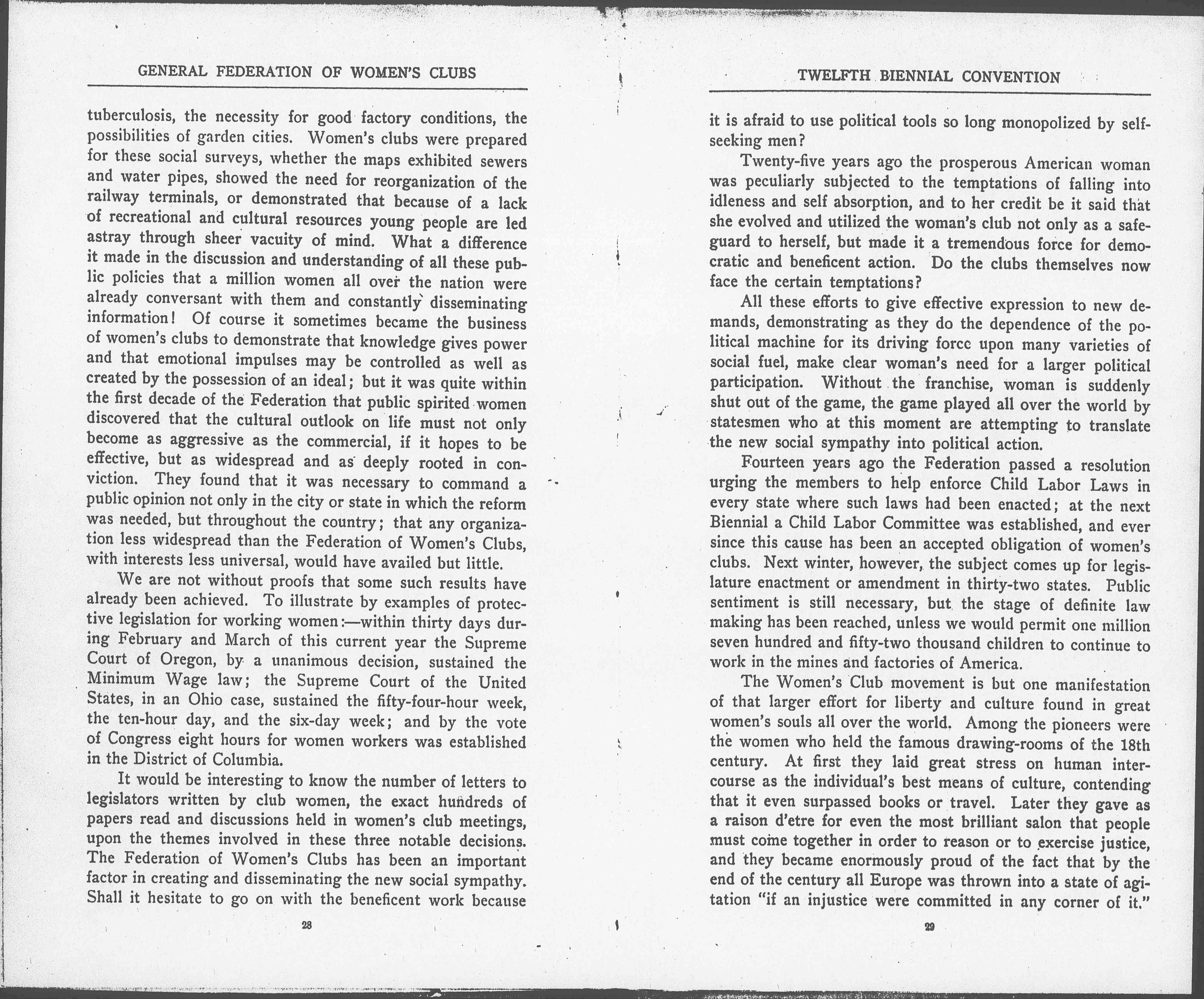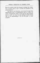 The Women's Club movement is but one manifestation of that larger effort for liberty and culture found in great women's souls all over the world. Among the pioneers were the women who held the famous drawing-rooms of the 18th century. At first they laid great stress on human intercourse as the individual's best means of culture, contending that it even surpassed books or travel. Later they gave as a raison d'etre for even the most brilliant salon that people must come together in order to reason or to exercise justice, and they became enormously proud of the fact that by the end of the century all Europe was thrown into a state of agitation "if an injustice were committed in any corner of it." [page 7] Have the women's clubs also learned to enlarge their definition of culture until at last it includes the abolition of all social injustices?
