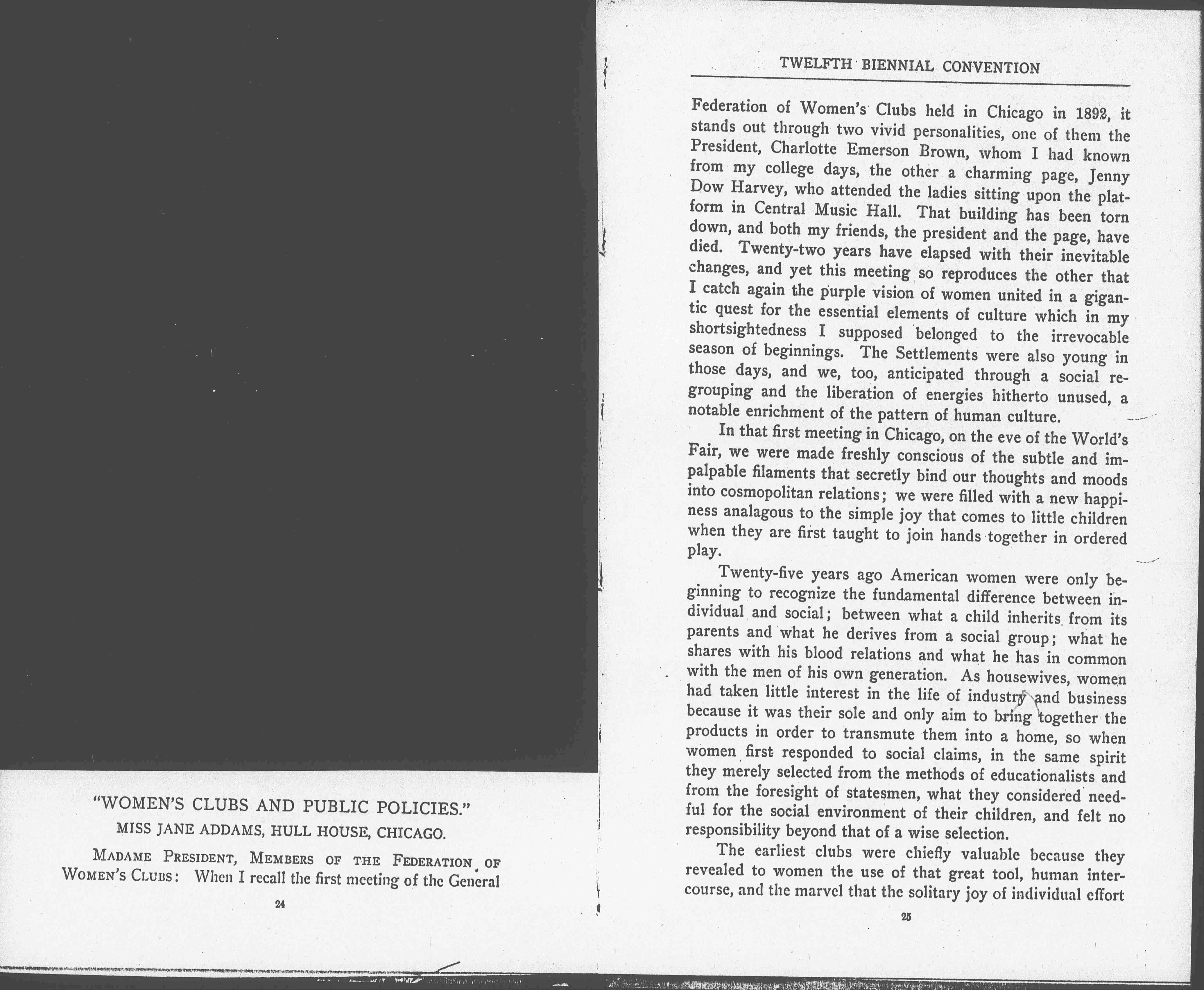 MADAME PRESIDENT, MEMBERS OF THE FEDERATION OF WOMEN'S CLUBS: When I recall the first meeting of the General [page 2] Federation of Women's Clubs held in Chicago in 1892, it stands out through two vivid personalities, one of them the President, Charlotte Emerson Brown, whom I had known from my college days, the other a charming page, Jenny Dow Harvey, who attended the ladies sitting upon the platform in Central Music Hall. That building has been torn down, and both my friends, the president and the page, have died. Twenty-two years have elapsed with their inevitable changes, and yet this meeting so reproduces the other that I catch again the purple vision of women united in a gigantic quest for the essential elements of culture which in my shortsightedness I supposed belonged to the irrevocable season of beginnings. The Settlements were also young in those days, and we, too, anticipated through a social regrouping and the liberation of energies hitherto unused, a notable enrichment of the pattern of human culture.