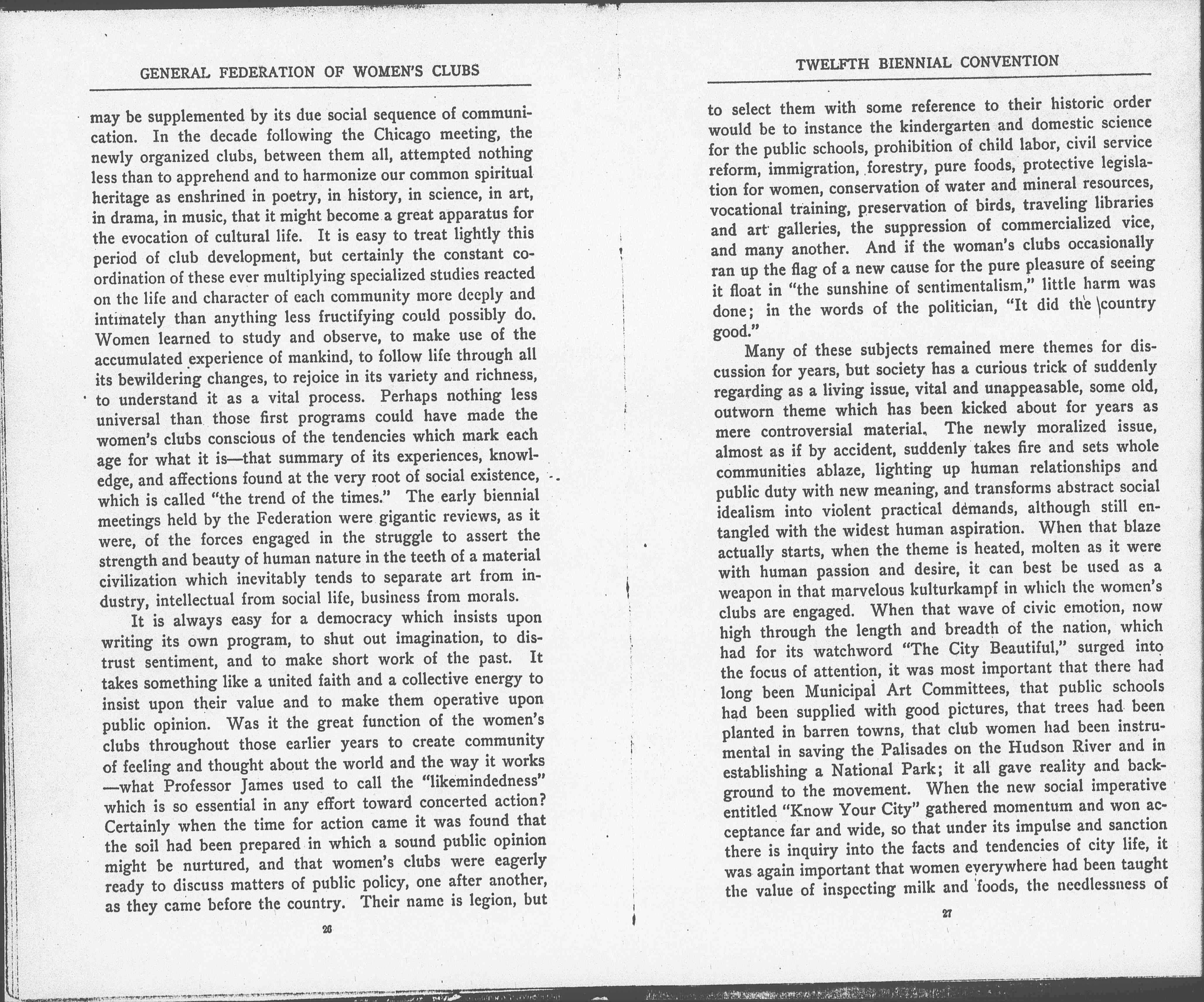 It is always easy for a democracy which insists upon writing its own program, to shut out imagination, to distrust sentiment, and to make short work of the past. It takes something like a united faith and a collective energy to insist upon their value and to make them operative upon public opinion. Was it the great function of the women's clubs throughout those earlier years to create community of feeling and thought about the world and the way it works -- what Professor James used to call the "likemindedness" which is so essential in any effort toward concerted action? Certainly when the time for action came it was found that the soil had been prepared in which a sound public opinion might be nurtured, and that women's clubs were eagerly ready to discuss matters of public policy, one after another, as they came before the country. Their name is legion, but [page 4] to select them with some reference to their historic order would be to instance the kindergarten and domestic science for the public schools, prohibition of child labor, civil service reform, immigration, forestry, pure foods, protective legislation for women, conservation of water and mineral resources, vocational training, preservation of birds, traveling libraries and art galleries, the suppression of commercialized vice, and many another. And if the woman's clubs occasionally ran up the flag of a new cause for the pure pleasure of seeing it float in "the sunshine of sentimentalism," little harm was done; in the words of the politician, "It did the country good."