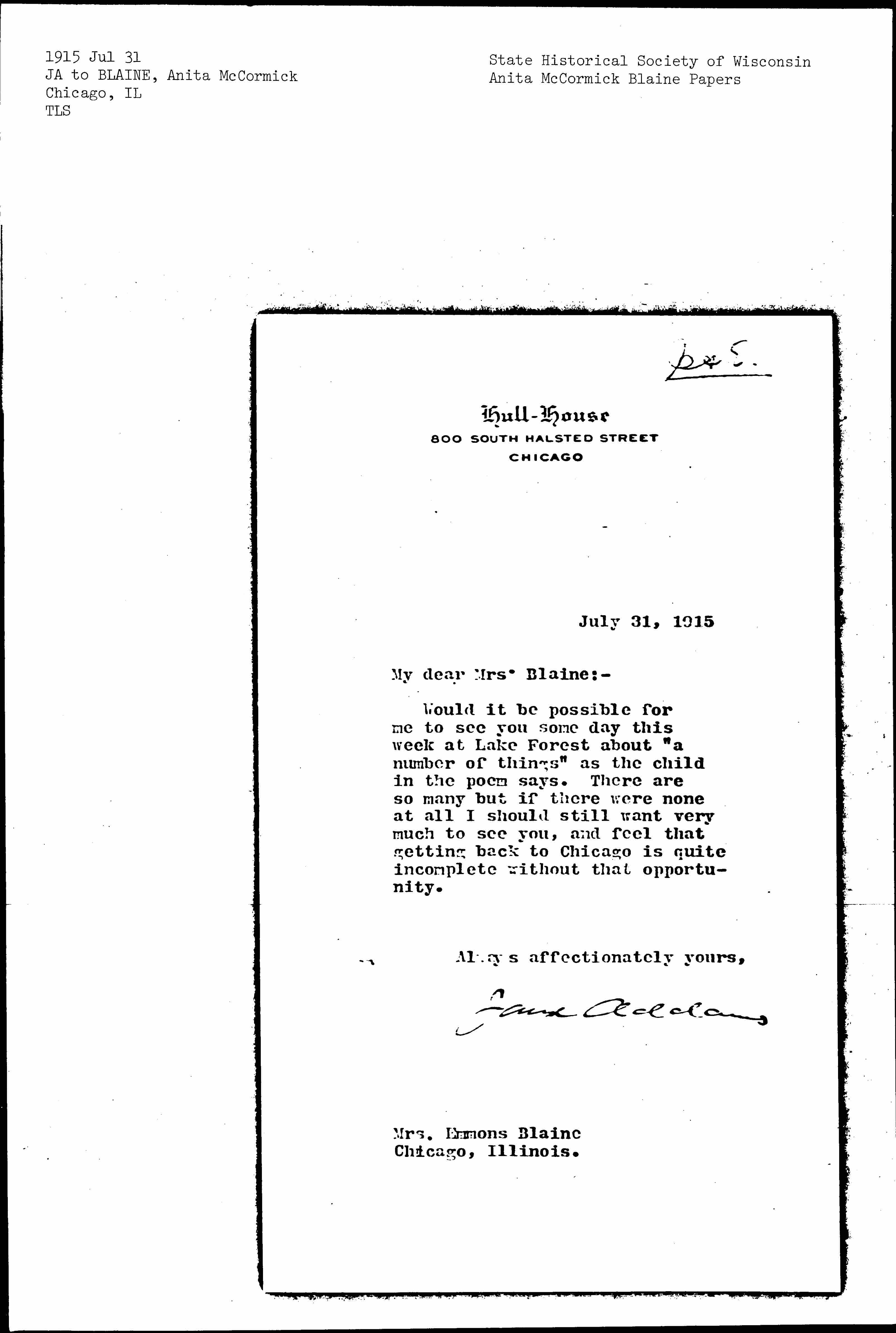 Would it be possible for me to see you some day this week at Lake Forest about "a number of things" as the child in the poem says. There are so many but if there were none at all I should still want very much to see you, and feel that getting back to Chicago is quite incomplete without that opportunity.