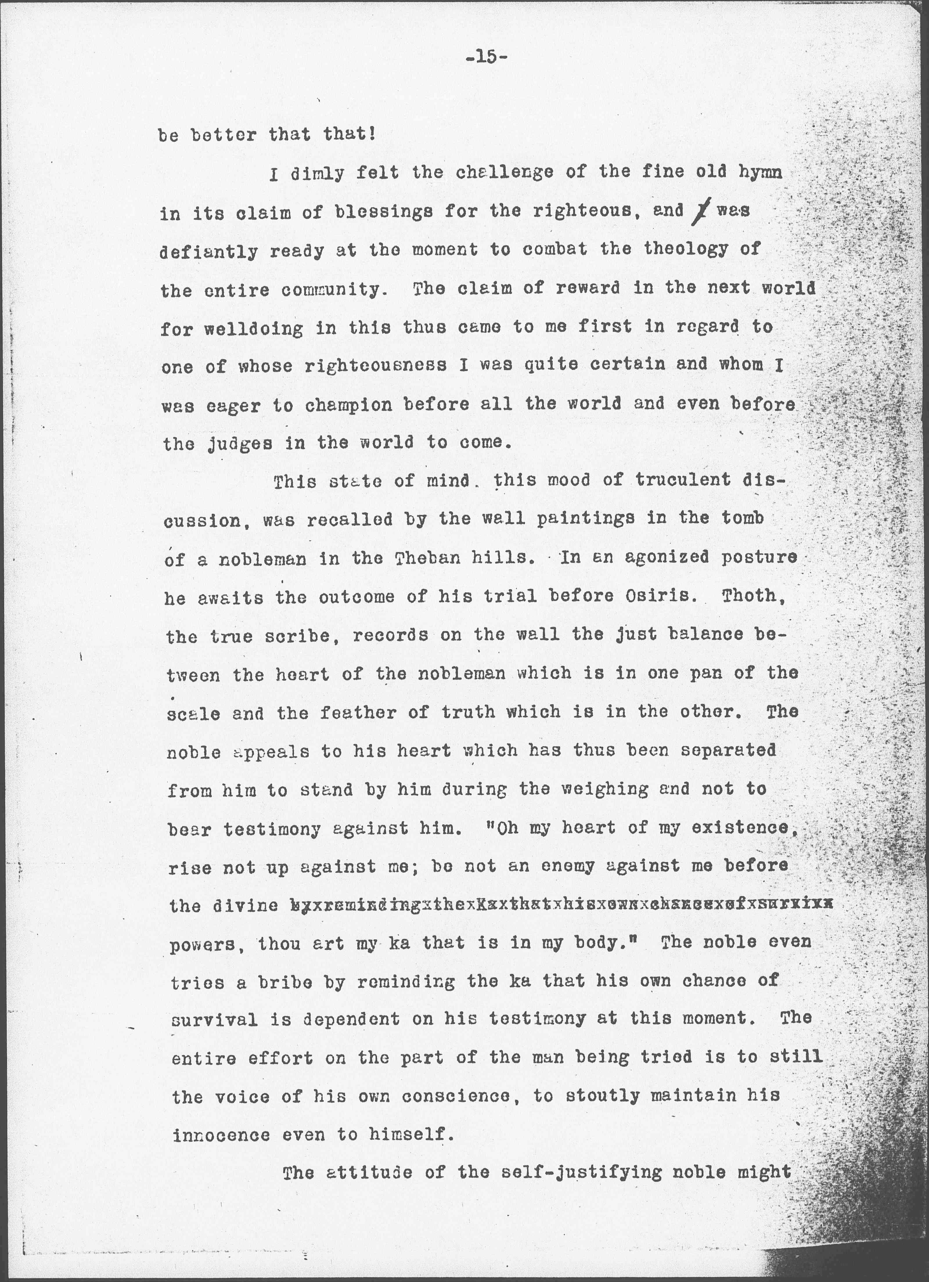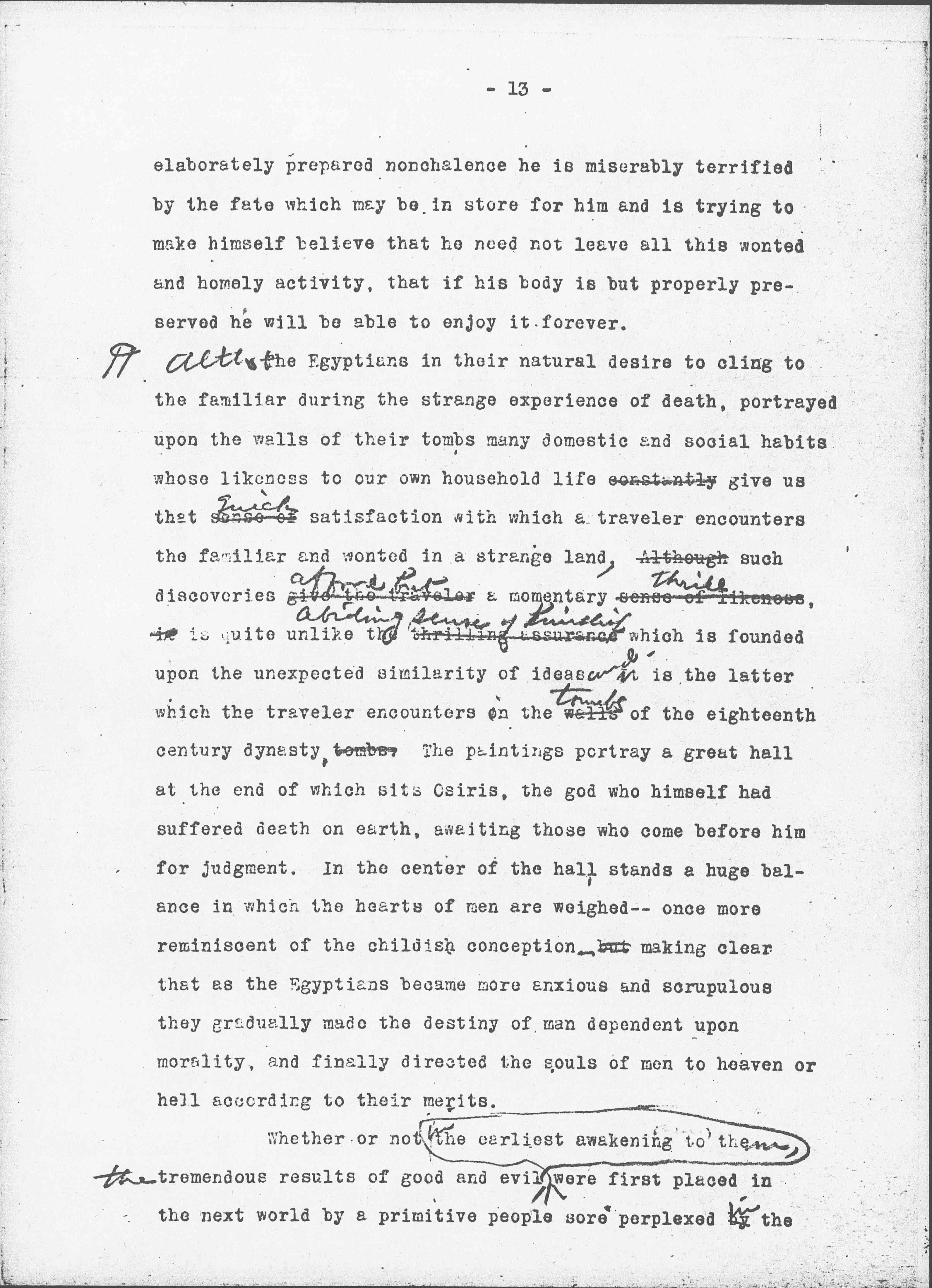 <[Although],> the Egyptians in their natural desire to cling to the familiar during the strange experience of death, portrayed upon the walls of their tombs many domestic and social habits whose likeness to our own household life constantly gives us that sense of <quick> satisfaction with which a traveler encounters the familiar and wonted in a strange land, Although such discoveries give the traveler <afford but> a momentary sense of likeness <thrill>, [illegible] is quite unlike the thrilling assurance <abiding sense of kinship> which is founded upon the unexpected similarity of ideas <and --> it is the latter which the traveler encounters on the walls <tombs> of the eighteenth century dynasty, tombs. The paintings portray a great hall at the end of which sits Osiris, the god who himself had suffered death on earth, awaiting those who come before him for judgment. In the center of the hall stands a huge balance in which the hearts of men are weighed -- once more reminiscent of the childish conception but making clear that as the Egyptians became more anxious and scrupulous they gradually made the destiny of man dependent upon morality, and finally directed the souls of men to heaven or hell according to their merits.