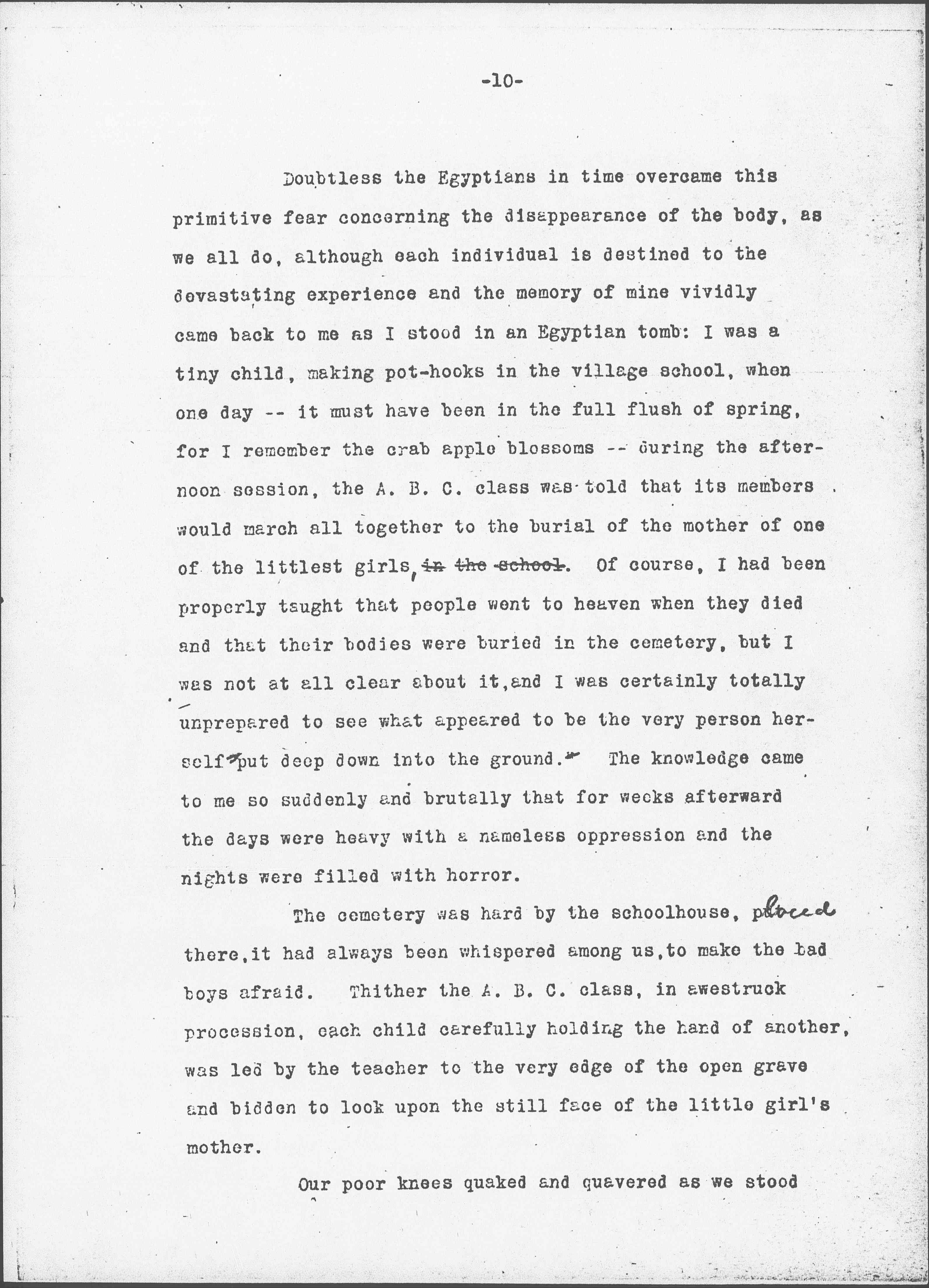 Our poor knees quaked and quavered as we stood [page 11] shelterless and unattended by family protection or even by friendly grownups, for the one tall teacher, while clearly visible, seemed inexpressibly far away as we kept an uncertain footing on the freshly spaded earth, hearing the preacher's voice, the sobs of the motherless children and, crowning horror of all, the hollow sounds of three clods of earth dropped impressively upon the coffin lid.
