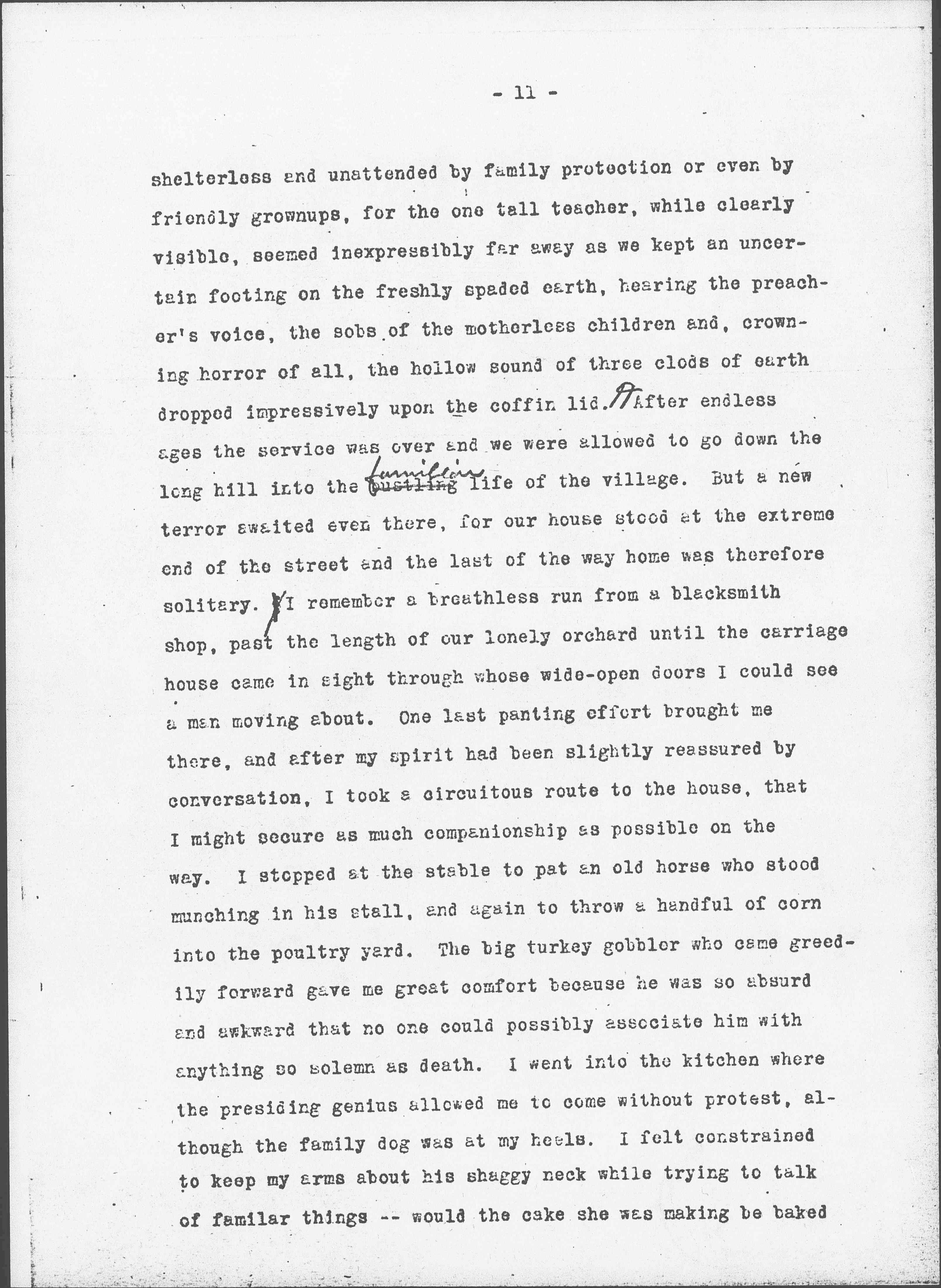 After endless ages the service was over and we were allowed to go down the long hill into the bustling <familiar> life of the village. But a new terror awaited even there, for our house stood at the extreme end of the street and the last of the way home was therefore solitary. I remember a breathless run from a blacksmith shop, past the length of our lonely orchard until the carriage house came in sight through whose wide-open doors I could see a man moving about. One last panting effort brought me there, and after my spirit had been slightly reassured by conversation, I took a circuitous route to the house, that I might secure as much companionship as possible on the way. I stopped at the stable to pat an old horse who stood munching in his stall, and again to throw a handful of corn into the poultry yard. The big turkey gobbler who came greedily forward gave me great comfort because he was so absurd and awkward that no one could possibly associate him with anything so solemn as death. I went into the kitchen where the presiding genius allowed me to come without protest, although the family dog was at my heels. I felt constrained to keep my arms about his shaggy neck while trying to talk of familiar things -- would the cake she was making be baked [page 12] in the little round tins or in the big square one -- but although these idle words were on my lips I wanted to cry out that "their mother was dead, whatever, whatever would the children do?" These words which I had overheard as we came away from the graveyard referred doubtless to the immediate future of the little family, but in my mind were translated into a definite demand for definite action on the part of the children against this horrible thing which had befallen their mother.