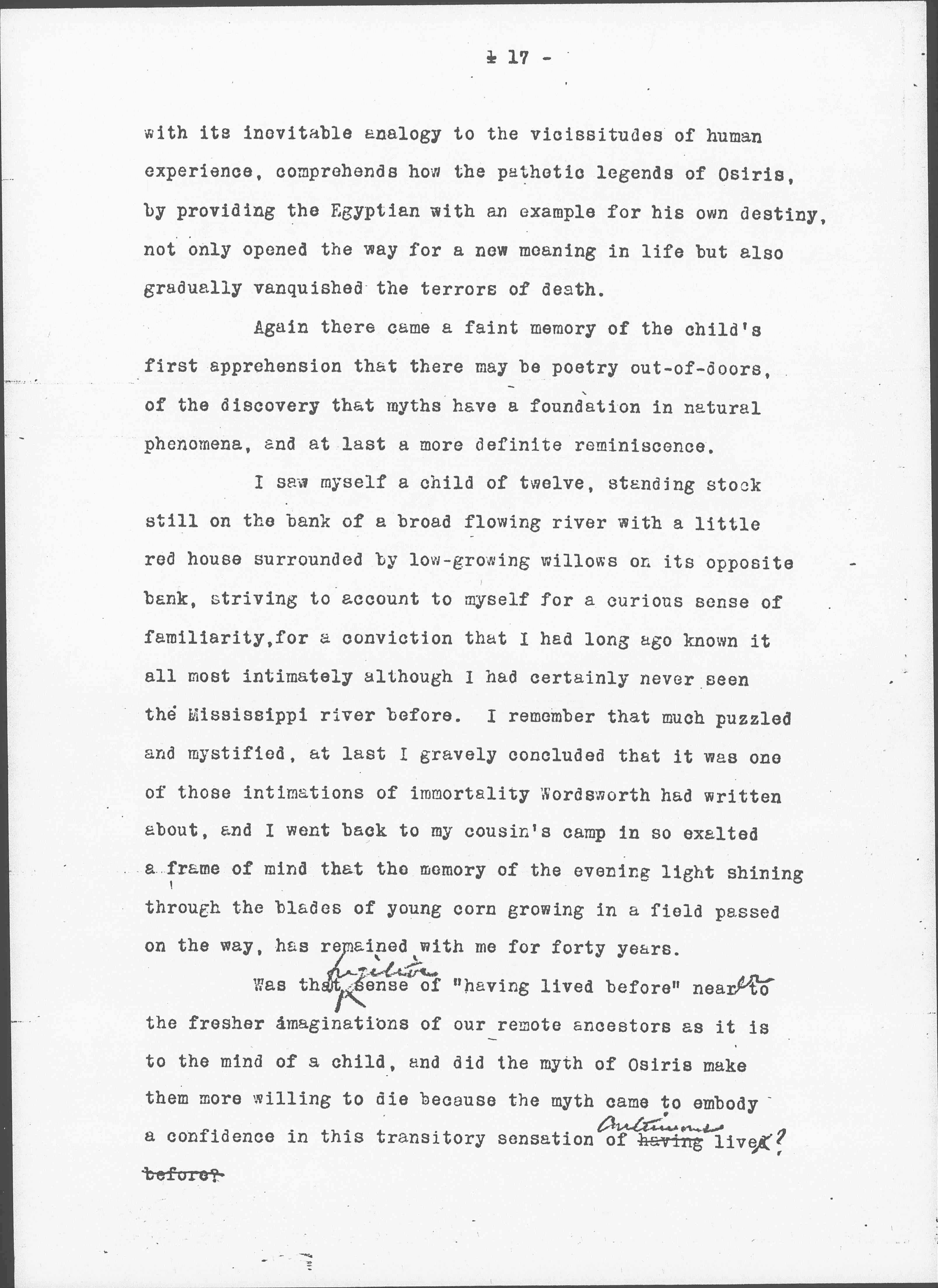Was that <fugitive> sense of "having lived before" nearer to the fresher imaginations of our remote ancestors as it is to the mind of a child, and did the myth of Osiris make them more willing to die because the myth came to embody a confidence in this transitory sensation of having continuous [life]? before? [page 18]