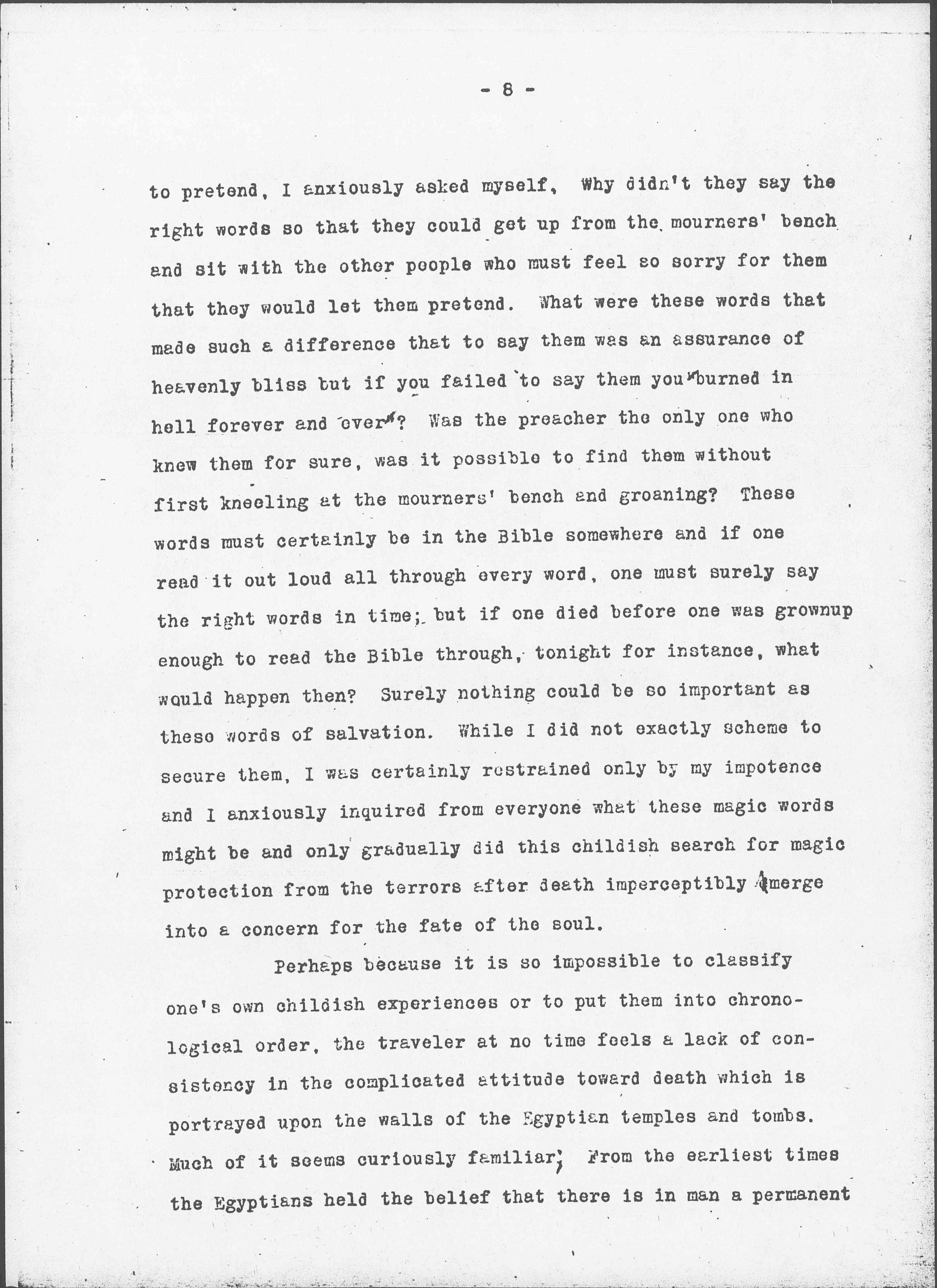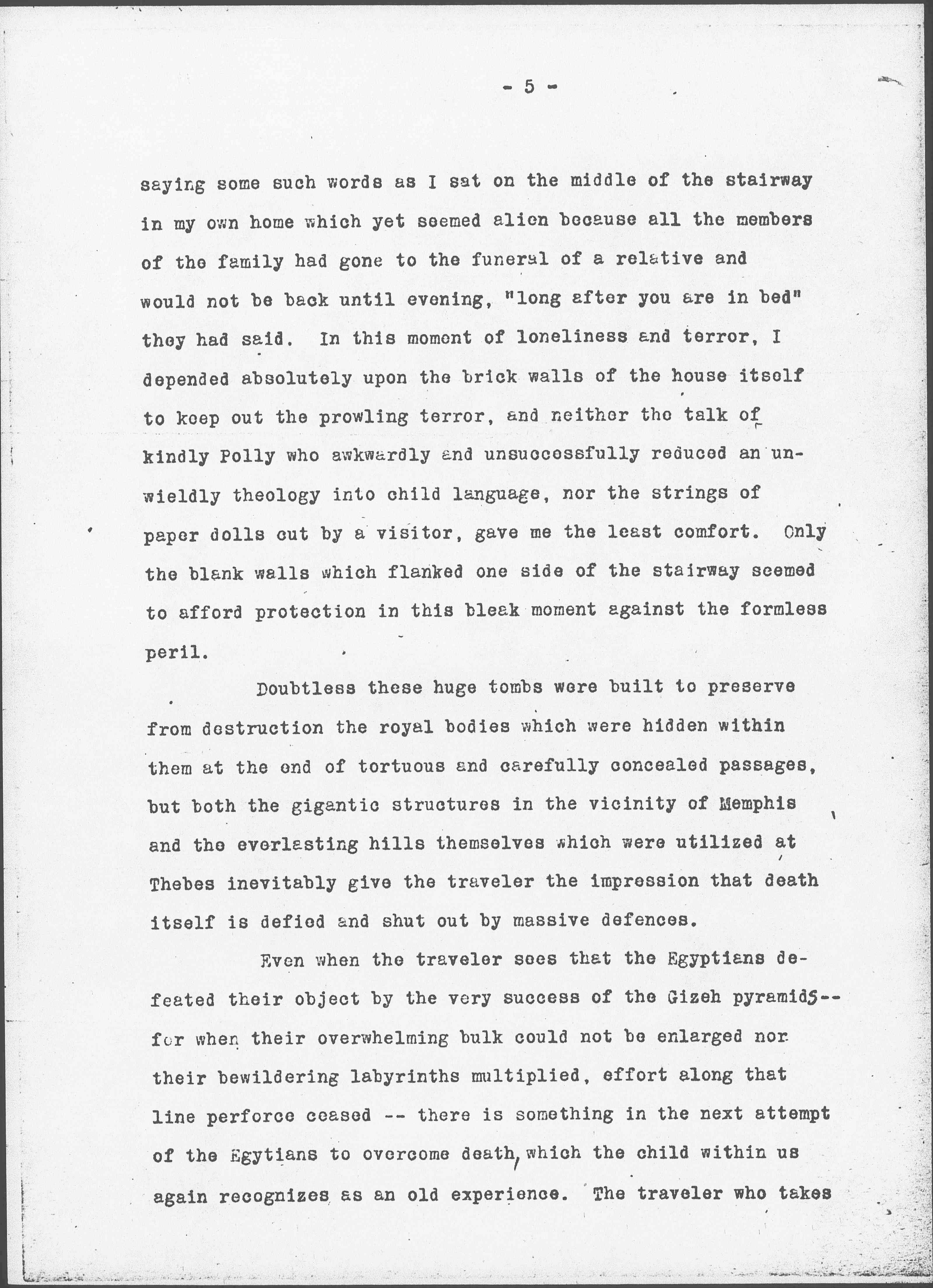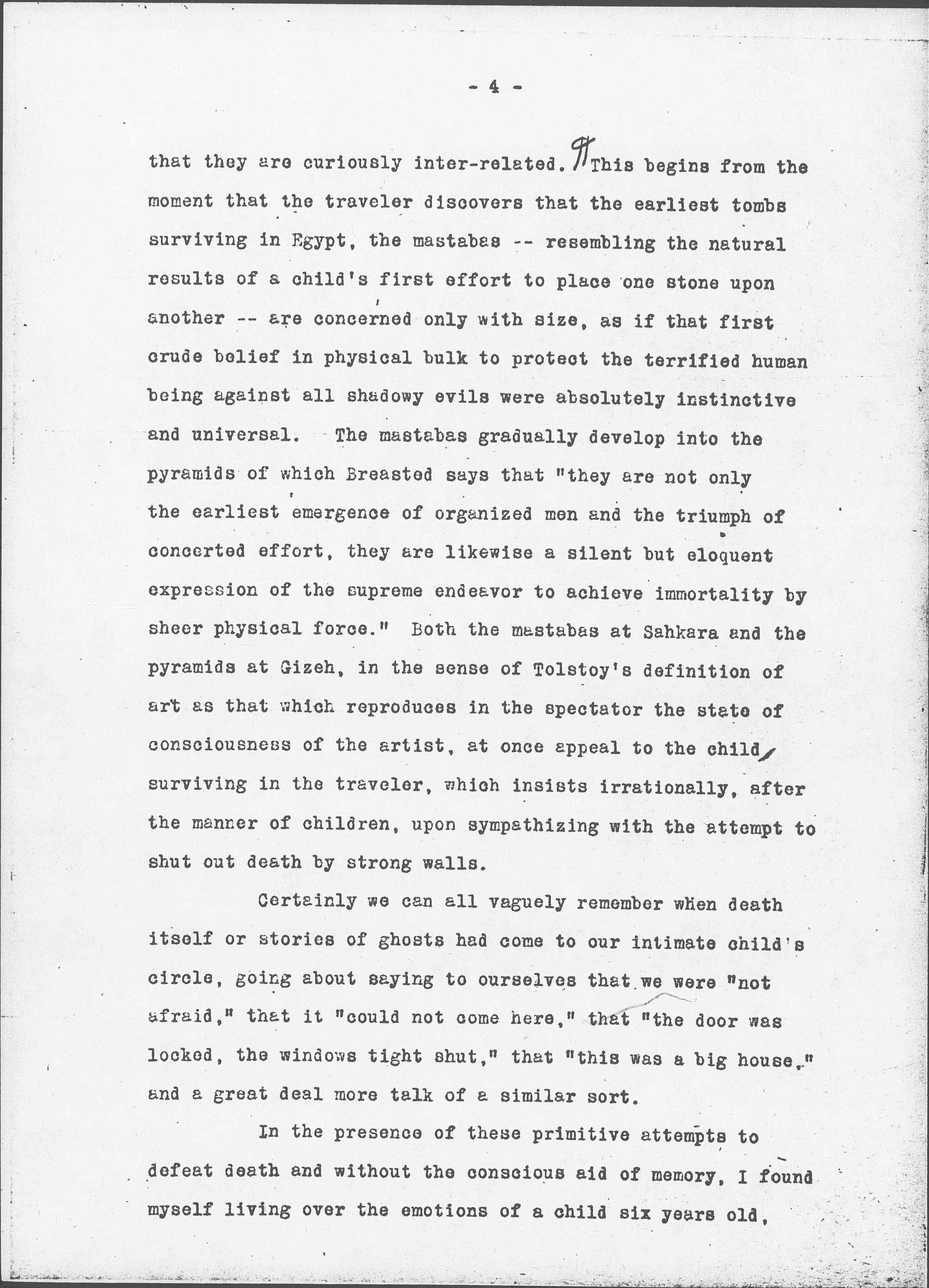 Even when the traveler sees that the Egyptians defeated their object by the very success of the [Giza] pyramids -- for when their overwhelming bulk could not be enlarged nor their bewildering labyrinths multiplied, effort along that line perforce ceased -- there is something in the next attempt of the Egyptians to overcome death, which the child within us again recognizes as an old experience. The traveler who takes [page 6] pains to inquire concerning the meaning of the texts which were inscribed on the inner walls of the pyramids and <the> early tombs finds that the familiar terror of death is still there although expressed somewhat more subtly; that the Egyptians are trying to outwit death by magic tricks.