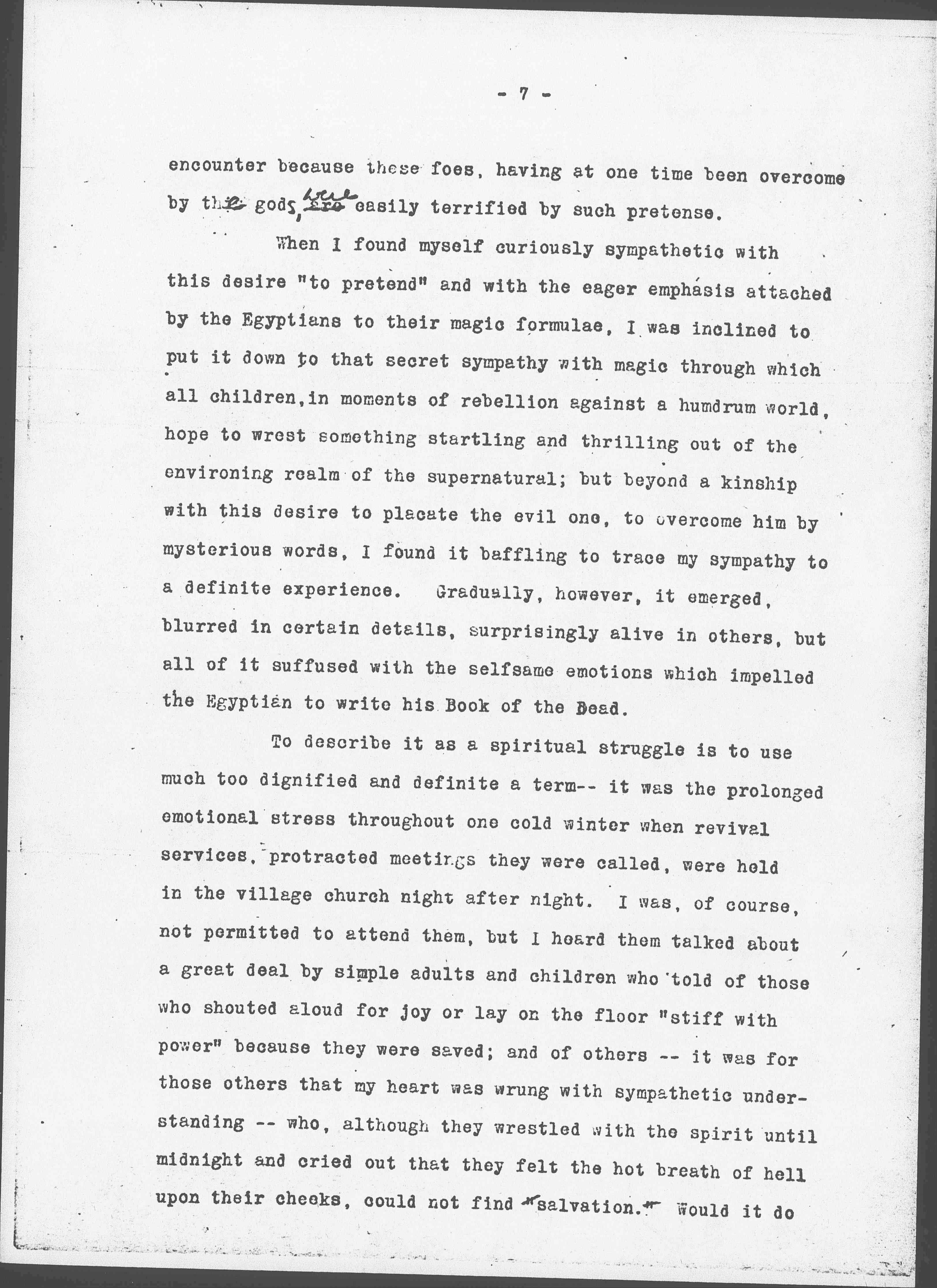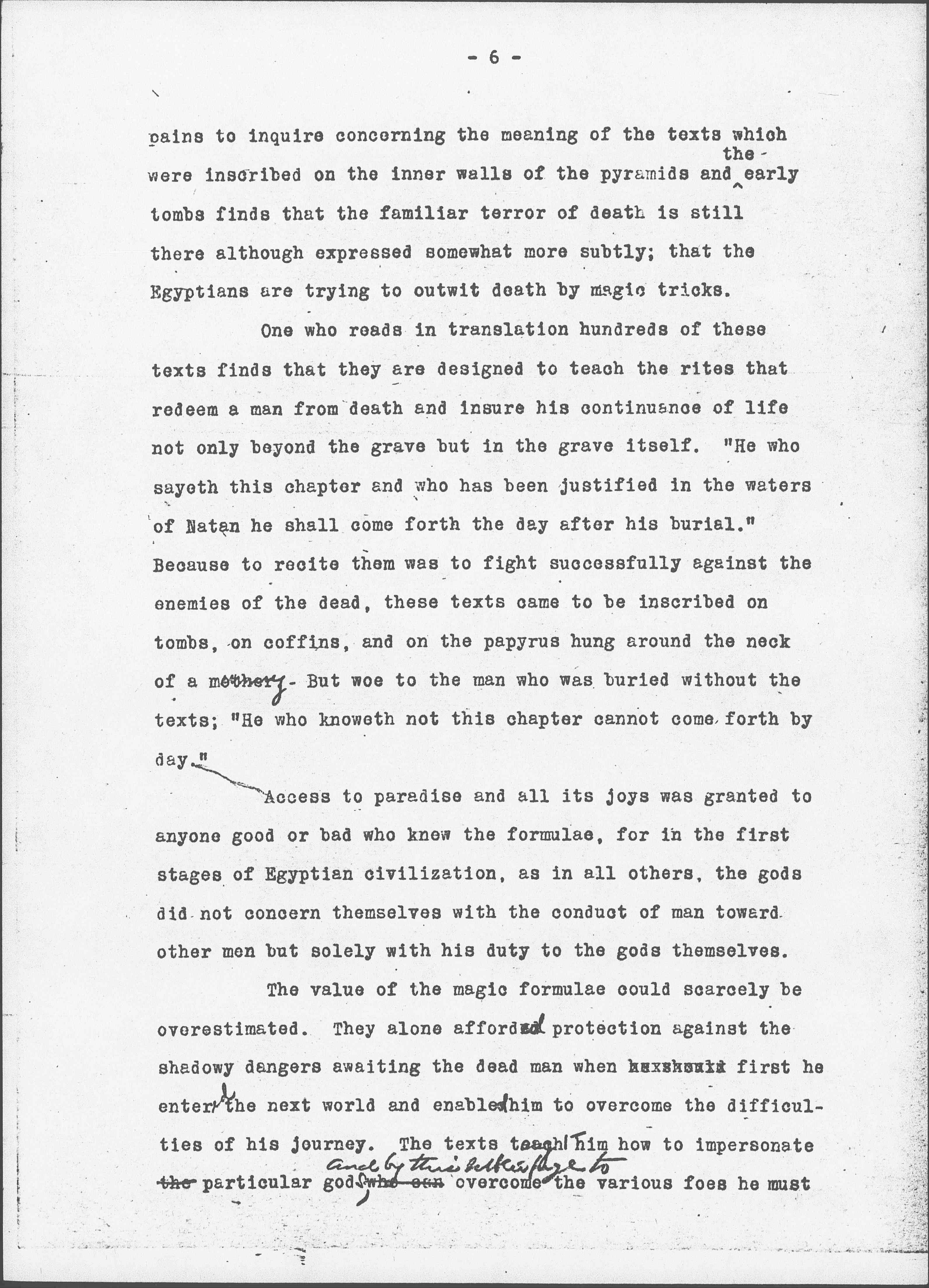 The value of the magic formulae could scarcely be overestimated. They alone afforded protection against the shadowy dangers awaiting the dead man when [illegible] first he entered the next world and enabled him to overcome the difficulties of his journey. The texts taught him how to impersonate the particular gods, who can <and by this subterfuge to> overcome the various foes he must [page 7] encounter because these foes, having at one time been overcome by the gods, are <were> easily terrified by such pretense.