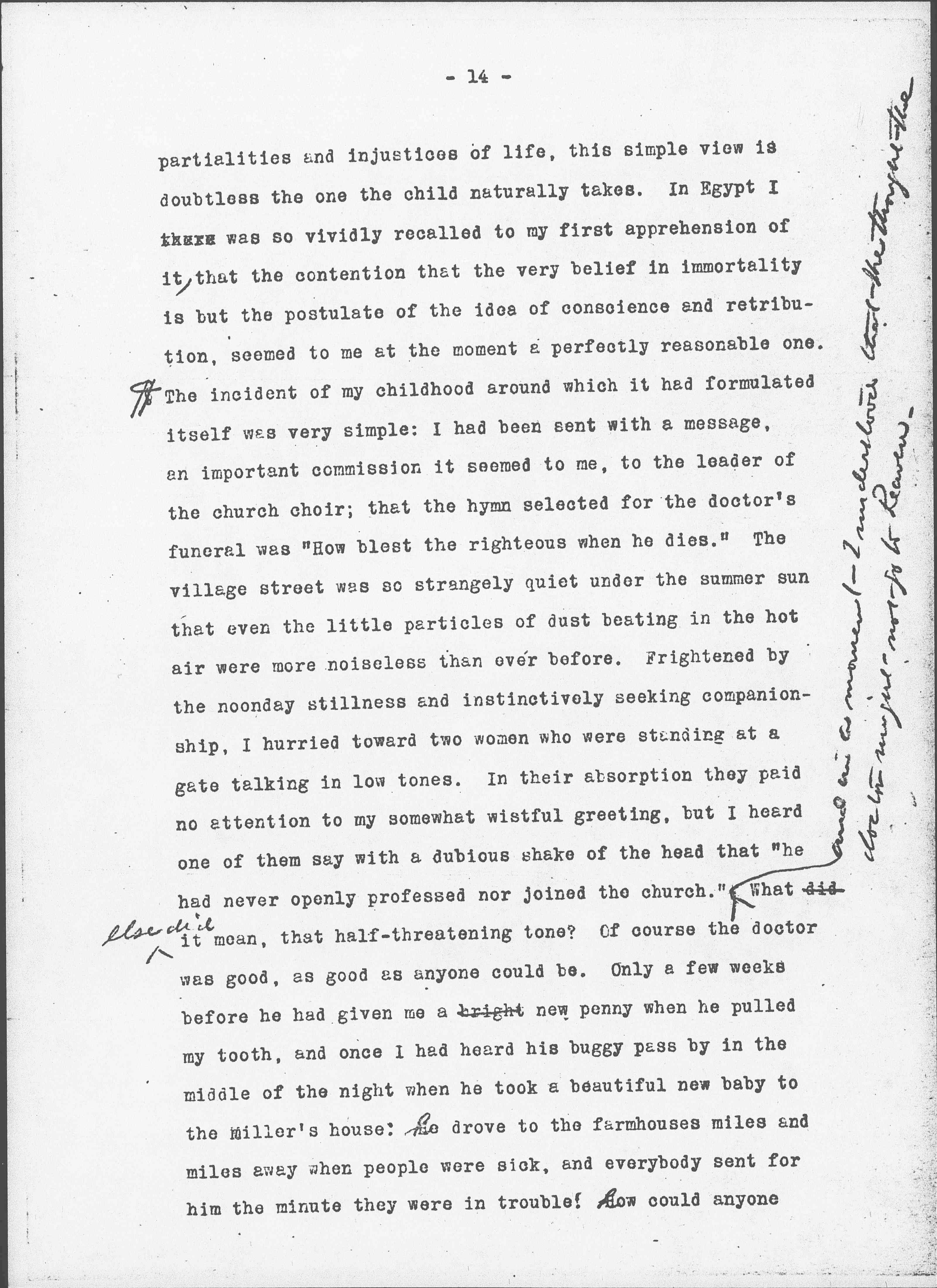The incident of my childhood around which it had formulated itself was very simple: I had been sent with a message, an important commission it seemed to me, to the leader of the church choir; that the hymn selected for the doctor's funeral was "How blest the righteous when he dies." The village street was so strangely quiet under the summer sun that even the little particles of dust beating in the hot air were more noiseless than ever before. Frightened by the noonday stillness and instinctively seeking companionship, I hurried toward two women who were standing at a gate talking in low tones. In their absorption they paid no attention to my somewhat wistful greeting, but I heard one of them say with a dubious shake of the head that "he had never openly professed nor joined the church." <and in a moment I understood that she thought the doctor might not go to heaven.> What did <else did> it mean, that half-threatening tone? Of course the doctor was good, as good as anyone could be. Only a few weeks before he had given me a bright new penny when he pulled my tooth, and once I had heard his buggy pass by in the middle of the night when he took a beautiful baby to the miller's house: he drove to the farmhouses miles and miles away when people were sick, and everybody sent for him the minute they were in trouble! how could anyone [page 15] be better than that!