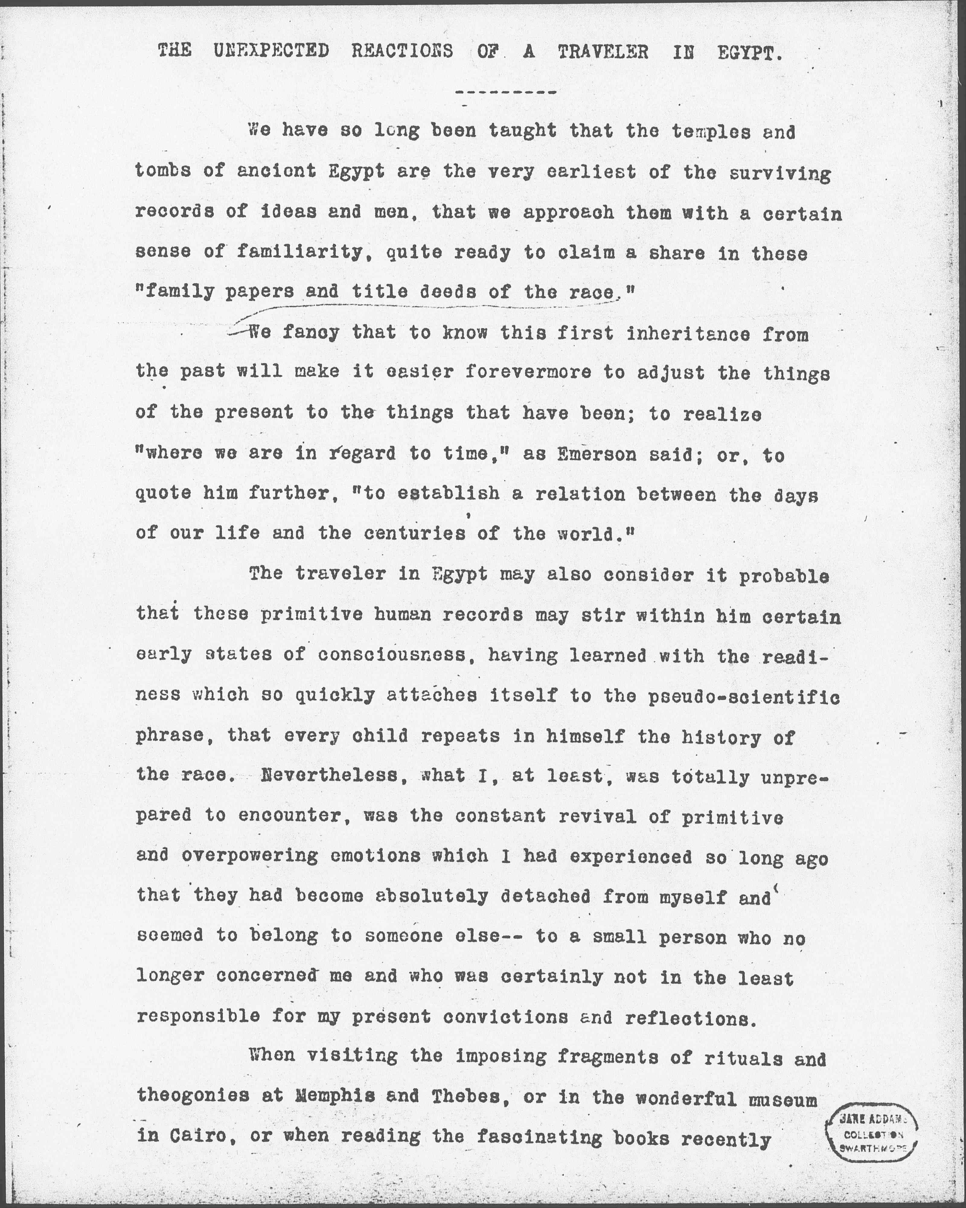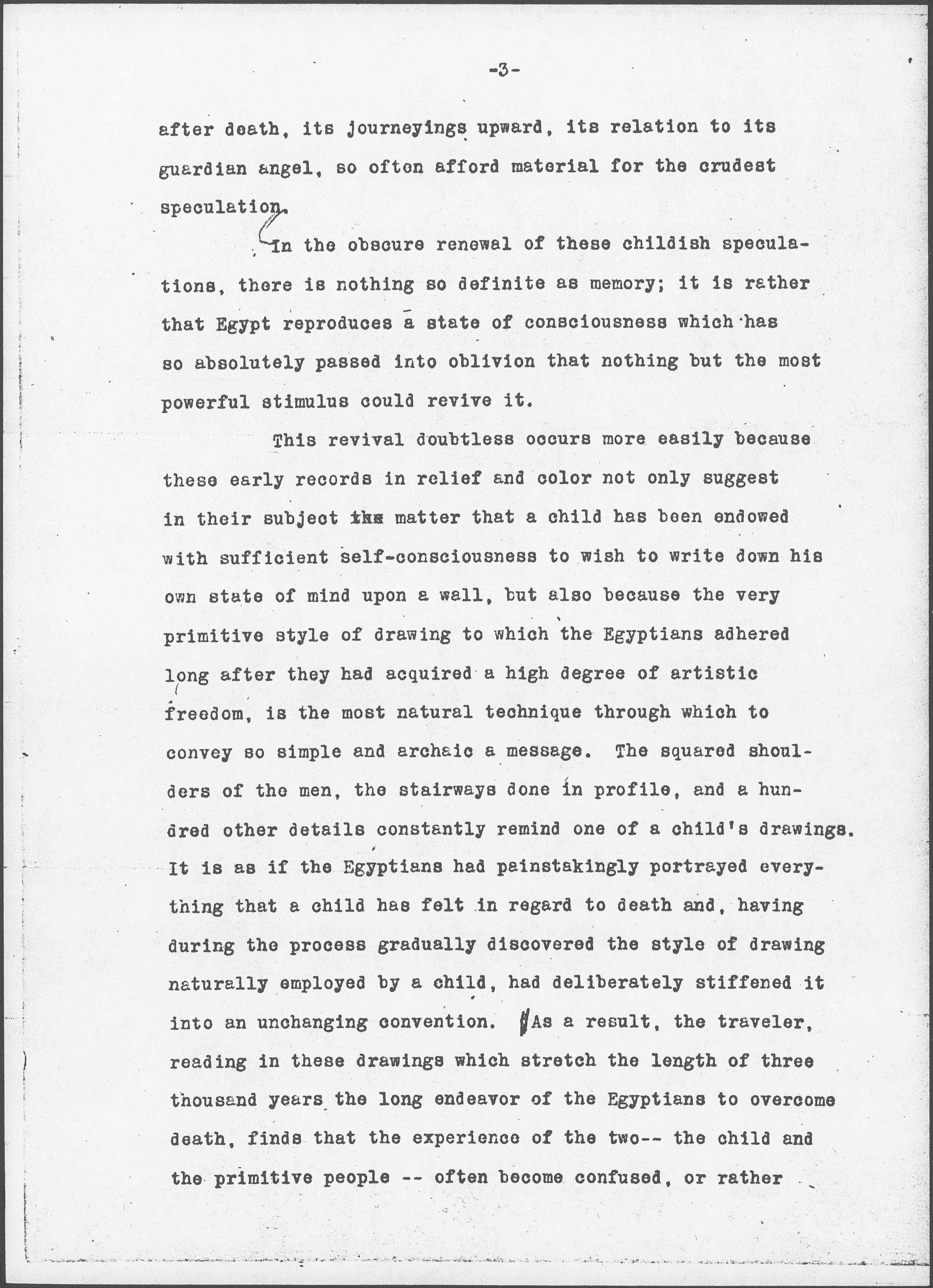 It may have been because these records of the early Egyptians are so endlessly preoccupied with death, portraying man's earliest efforts to defeat it, his eager desire to survive, to enter by force or <by> guile into the heavens of the Western sky, that the mind is pushed back into that earliest childhood when the existence of the soul, its exact place of residence in the body, its experiences immediately [page 3] after death, its journeyings upward, its relation to its guardian angel, so often afford material for the crudest speculation. In the obscure renewal of these childish speculations, there is nothing so definite as memory; it is rather that Egypt reproduces a state of consciousness which has so absolutely passed into oblivion that nothing but the most powerful stimulus could revive it.