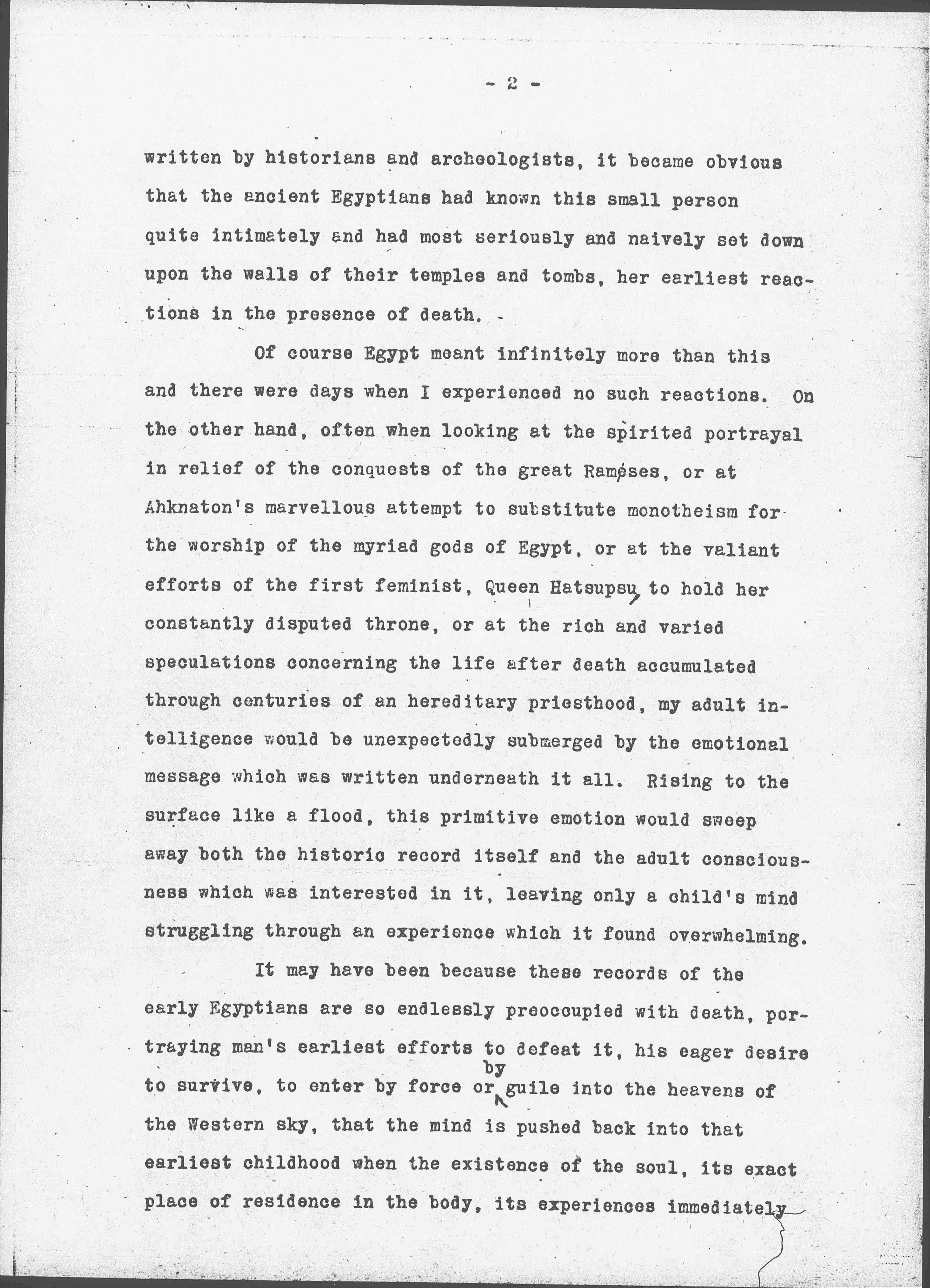 Of course Egypt meant infinitely more than this and there were days when I experienced no such reactions. On the other hand, often when looking at the spirited portrayal in relief of the conquests of the great Ramses, or at [Akhenaten's] marvelous attempt to substitute monotheism for the worship of the myriad gods of Egypt, or at the valiant efforts of the first feminist, Queen [Hatshepsut], to hold her constantly disputed throne, or at the rich and varied speculations concerning the life after death accumulated through centuries of an hereditary priesthood, my adult intelligence would be unexpectedly submerged by the emotional message which was written underneath it all. Rising to the surface like a flood, this primitive emotion would sweep away both the historic record itself and the adult consciousness which was interested in it, leaving only a child's mind struggling through an experience which it found overwhelming.