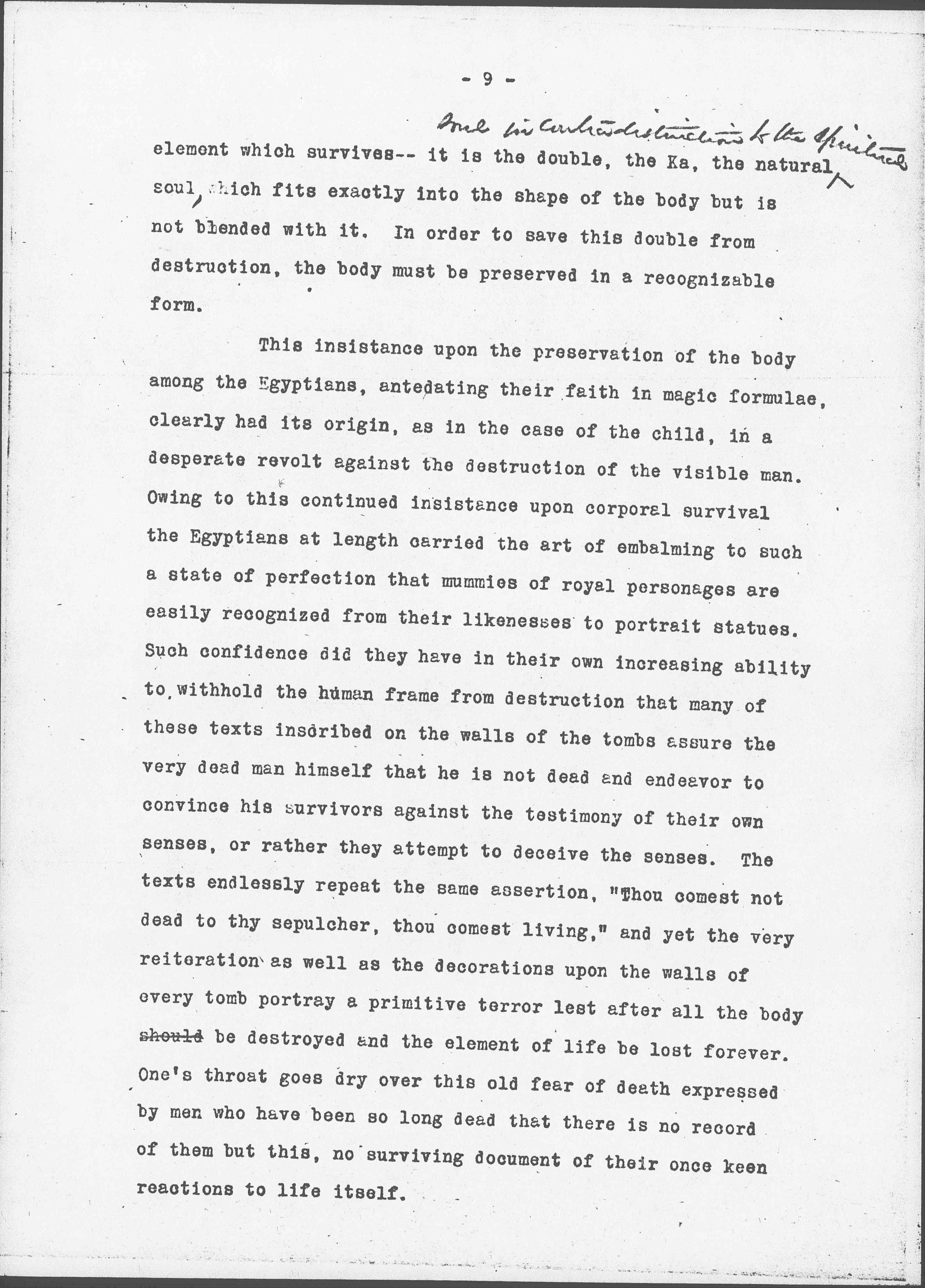 Perhaps because it is so impossible to classify one's own childish experiences or to put them into chronological order, the traveler at no time feels a lack of consistency in the complicated attitude toward death which is portrayed upon the walls of the Egyptian temples and tombs. Much of it seems curiously familiar; From the earliest times the Egyptians held the belief that there is in man a permanent [page 9] element which survives -- it is the double, the Ka, the natural <soul in contradistinction to the spiritual> soul, which fits exactly into the shape of the body but is not blended with it. In order to save this double from destruction, the body must be preserved in a recognizable form.
