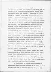 To describe it as a spiritual struggle is to use much too dignified and definite a term -- it was the prolonged emotional stress throughout one cold winter when revival services, protracted meetings they were called, were held in the village church night after night. I was, of course, not permitted to attend them, but I heard them talked about a great deal by simple adults and children who told of those who shouted aloud for joy or lay on the floor "stiff with power" because they were saved; and of others -- it was for those others that my heart was wrung with sympathetic understanding -- who, although they wrestled with the spirit until midnight and cried out that they felt the hot breath of hell upon their cheeks, could not find salvation. Would it do [page 8] to pretend, I anxiously asked myself, why didn't they say the right words so that they could get up from the mourners' bench and sit with the other people who must feel so sorry for them that they would let them pretend. What were these words that made such a difference that to say them was an assurance of heavenly bliss but if you failed to say them you burned in hell forever and ever? Was the preacher the only one who knew them for sure, was it possible to find them without first kneeling at the mourners' bench and groaning? These words must certainly be in the Bible somewhere and if one read it out loud all through every word, one must surely say the right words in time; but if one died before one was grownup enough to read the Bible through, tonight for instance, what would happen then? Surely nothing could be so important as these words of salvation. While I did not exactly scheme to secure them, I was certainly restrained only by my impotence and I anxiously inquired from everyone what these magic words might be and only gradually did this childish search for magic protection from the terrors after death imperceptibly merge into a concern for the fate of the soul.