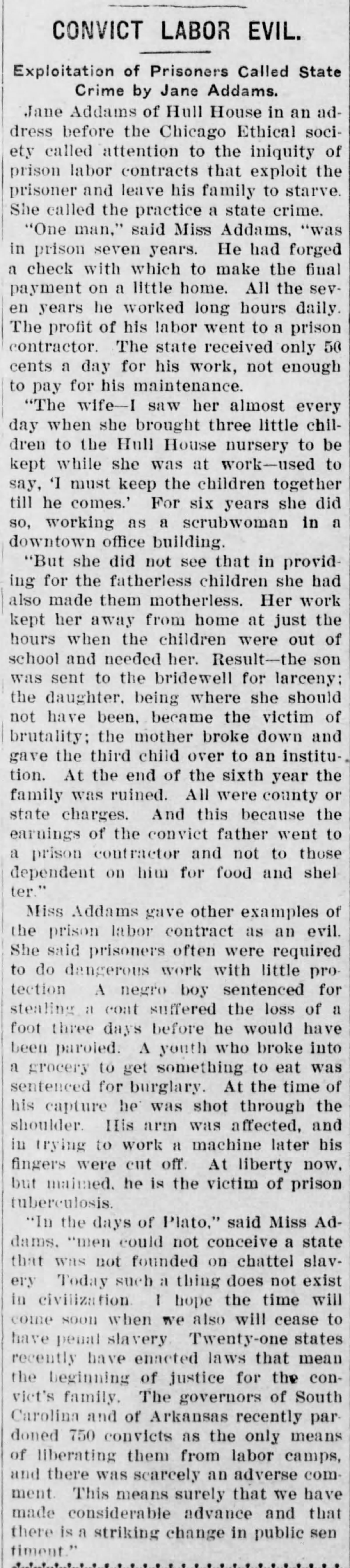 Jane Addams of Hull House in an address before the Chicago Ethical society called attention to the iniquity of prison labor contracts that exploit the prisoner and leave his family to starve. She called the practice a state crime.