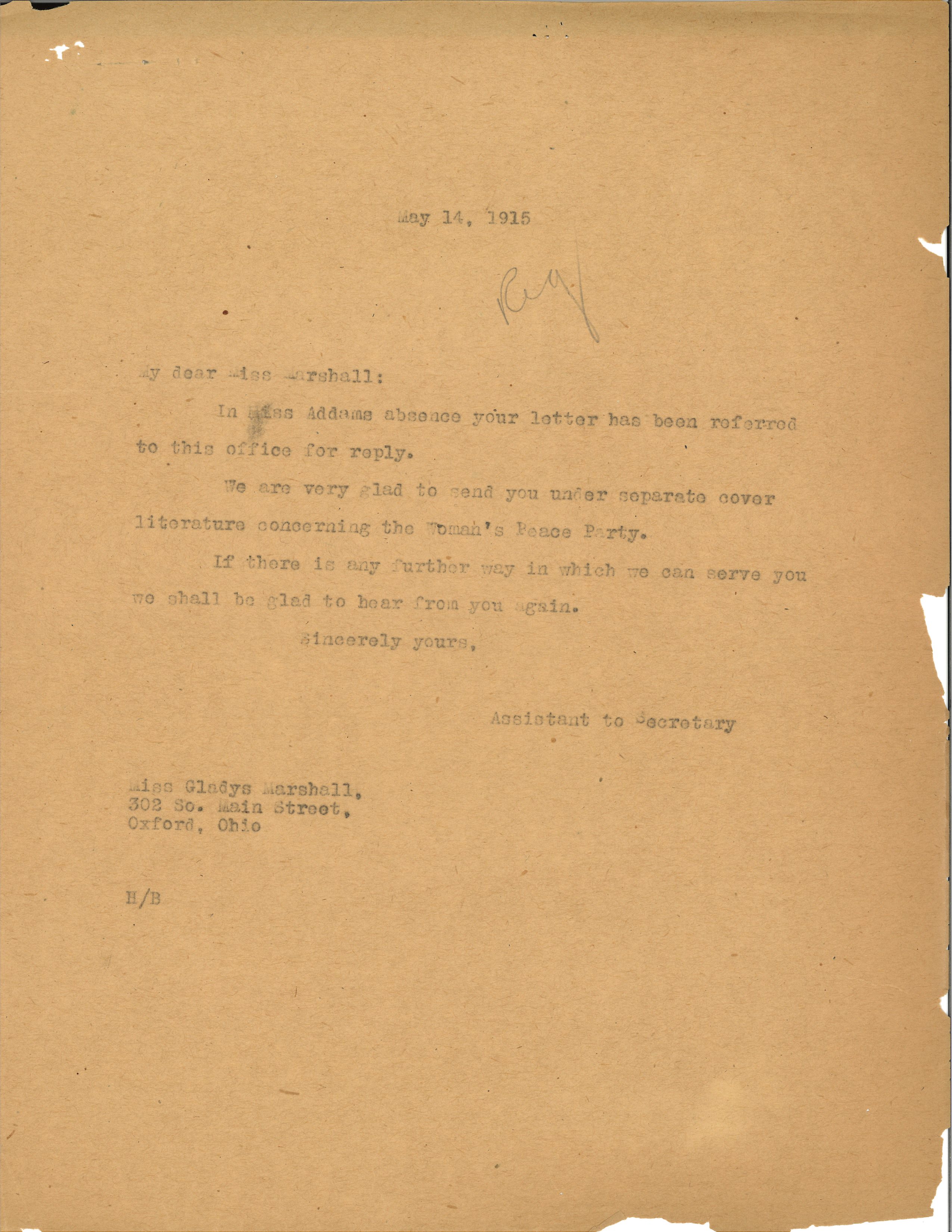 We are very glad to send you under separate cover literature concerning the Woman's Peace Party.