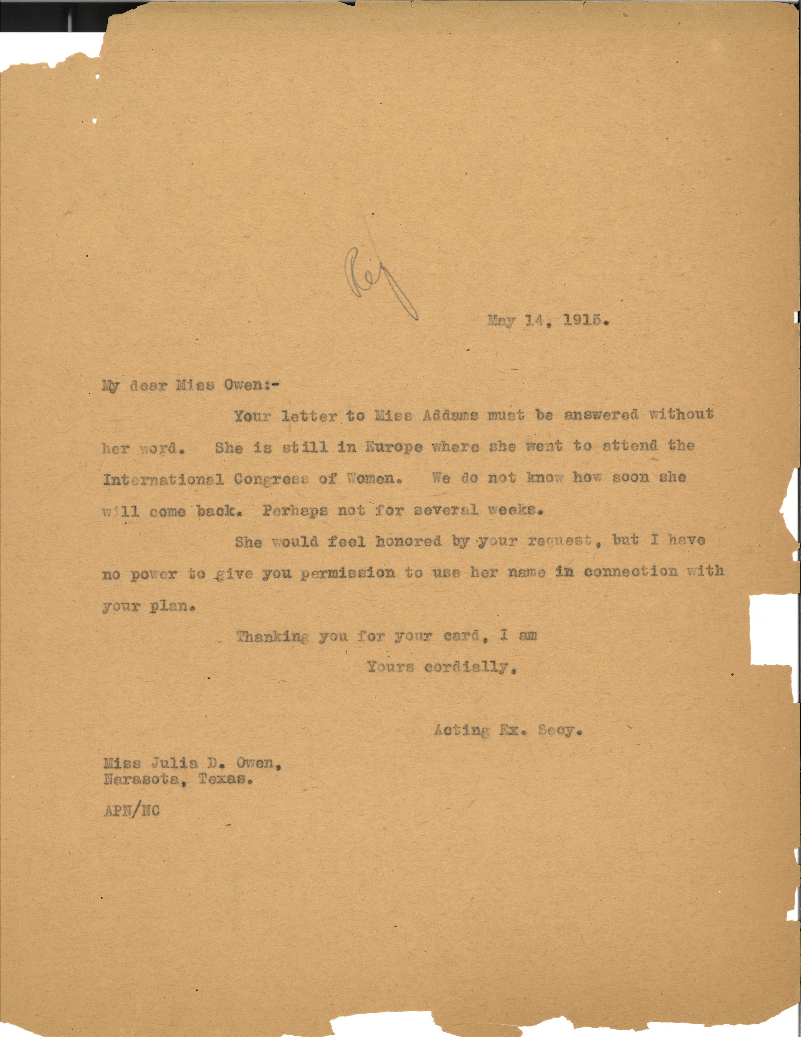 Your letter to Miss Addams must be answered without her [word]. She is still in Europe where she went to attend the International Congress of Women. We do not know how soon she will come back. Perhaps not for several weeks.