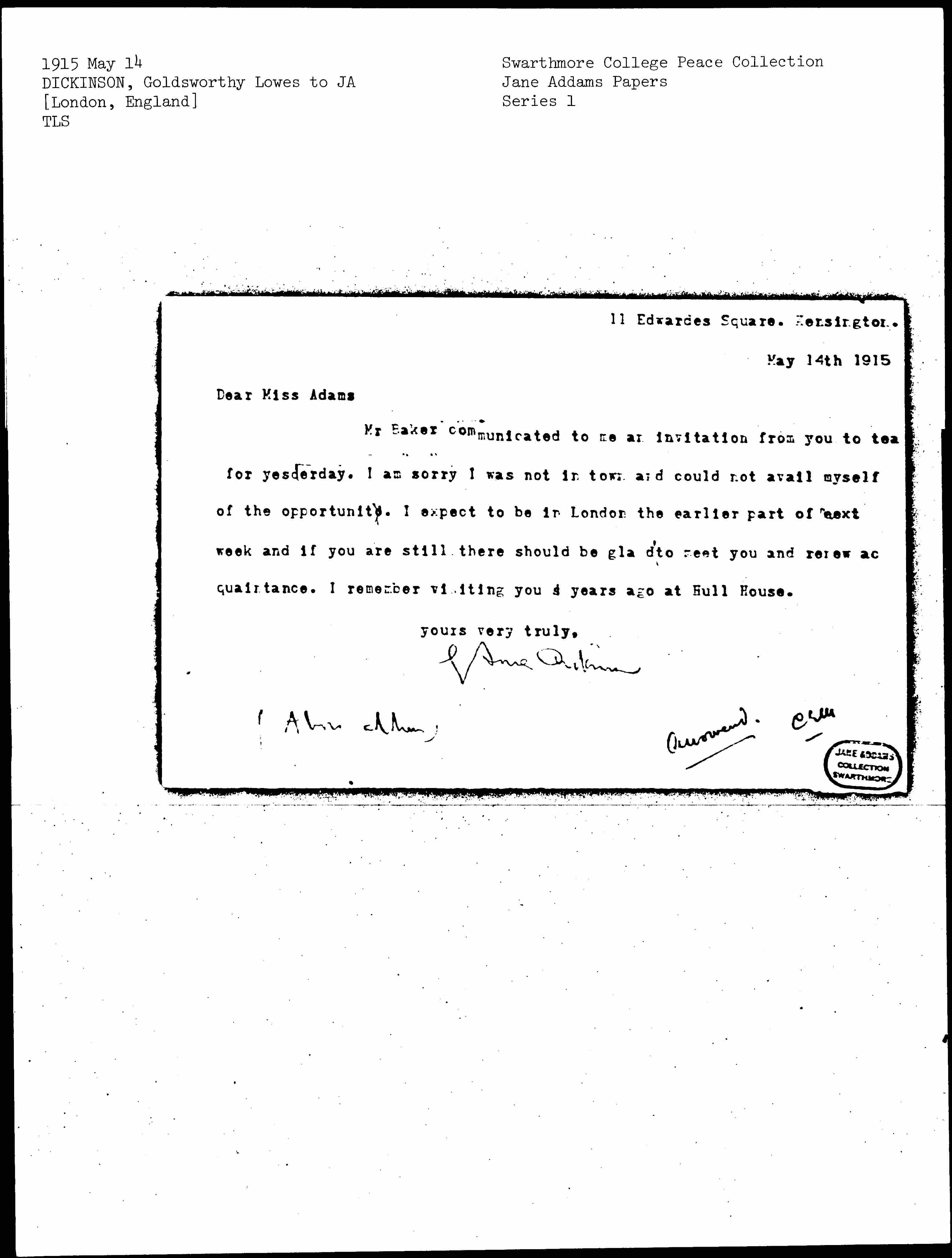 Mr Baker communicated to me an invitation from you to tea for yesterday. I am sorry I was not in town and could not avail myself of the opportunity. I expect to be in London the earlier part of next week and if you are still there should be glad to meet you and renew acquaintance. I remember visiting you years ago at Hull House.