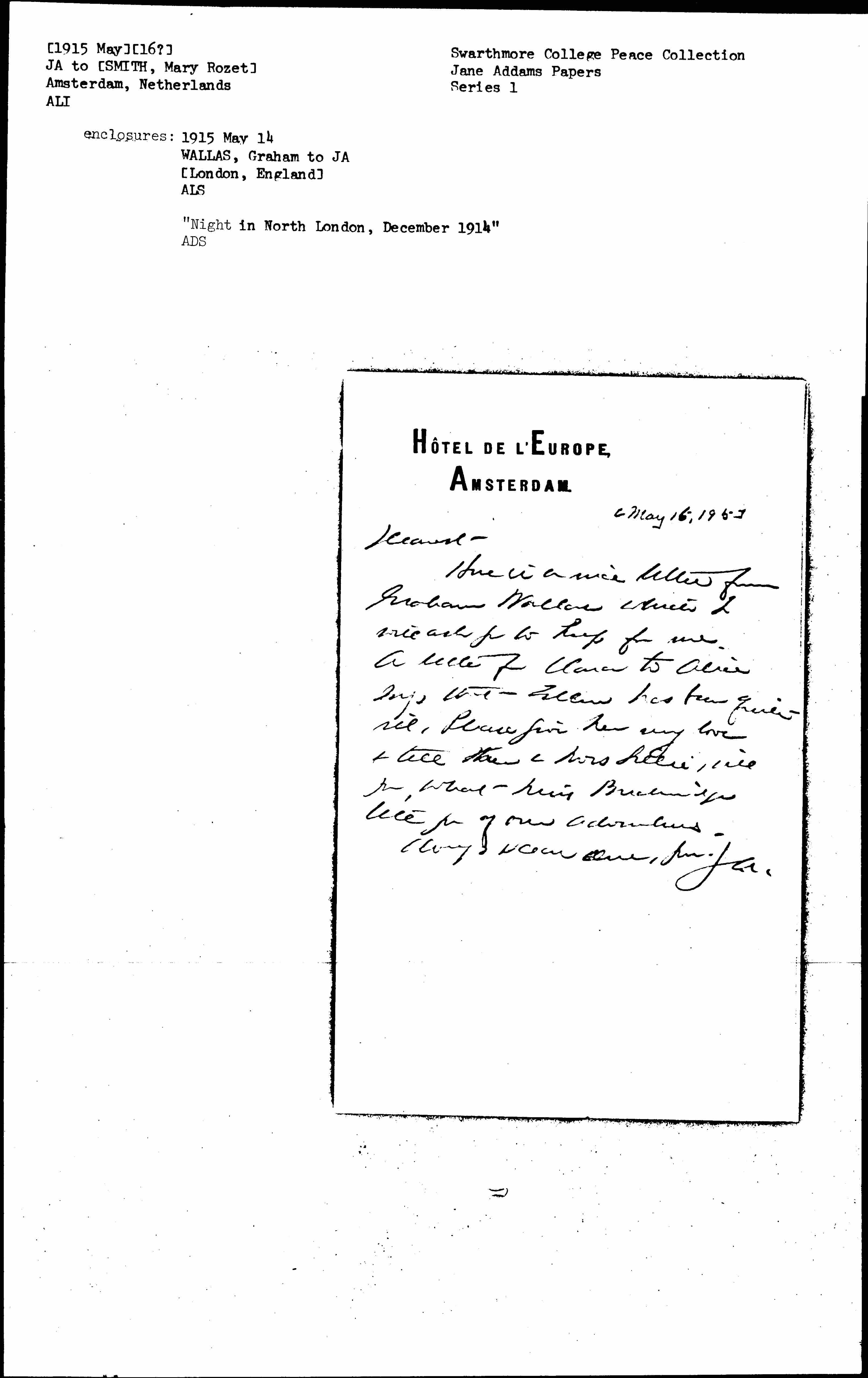 Here is a nice letter from Graham Wallas which I will ask you to keep for me. A letter from Clara to Alice says that Ellen has been quite ill. Please give her my love & tell [her] & Mrs Lillie, will you, what Miss Breckinridge tells you of our adventures.