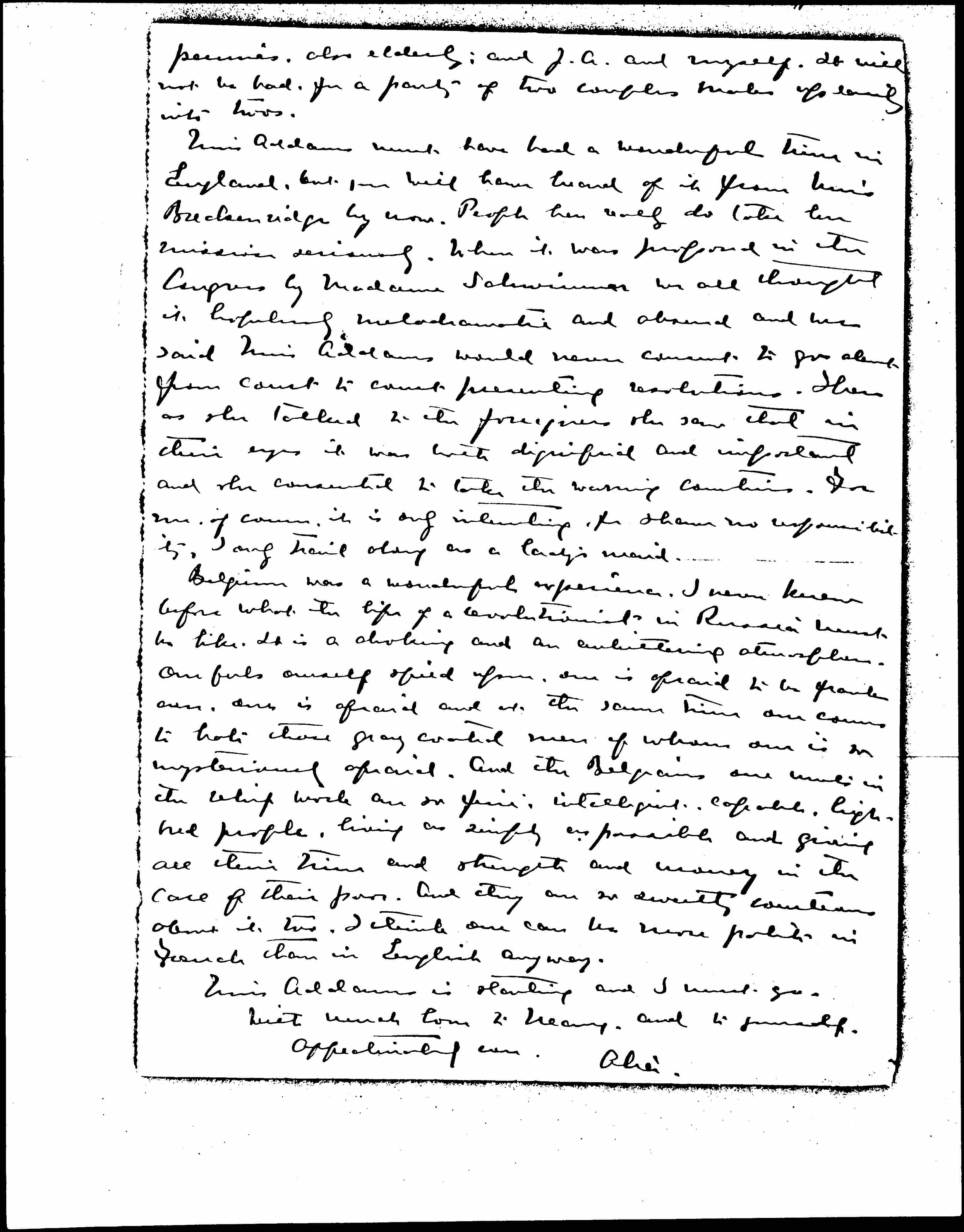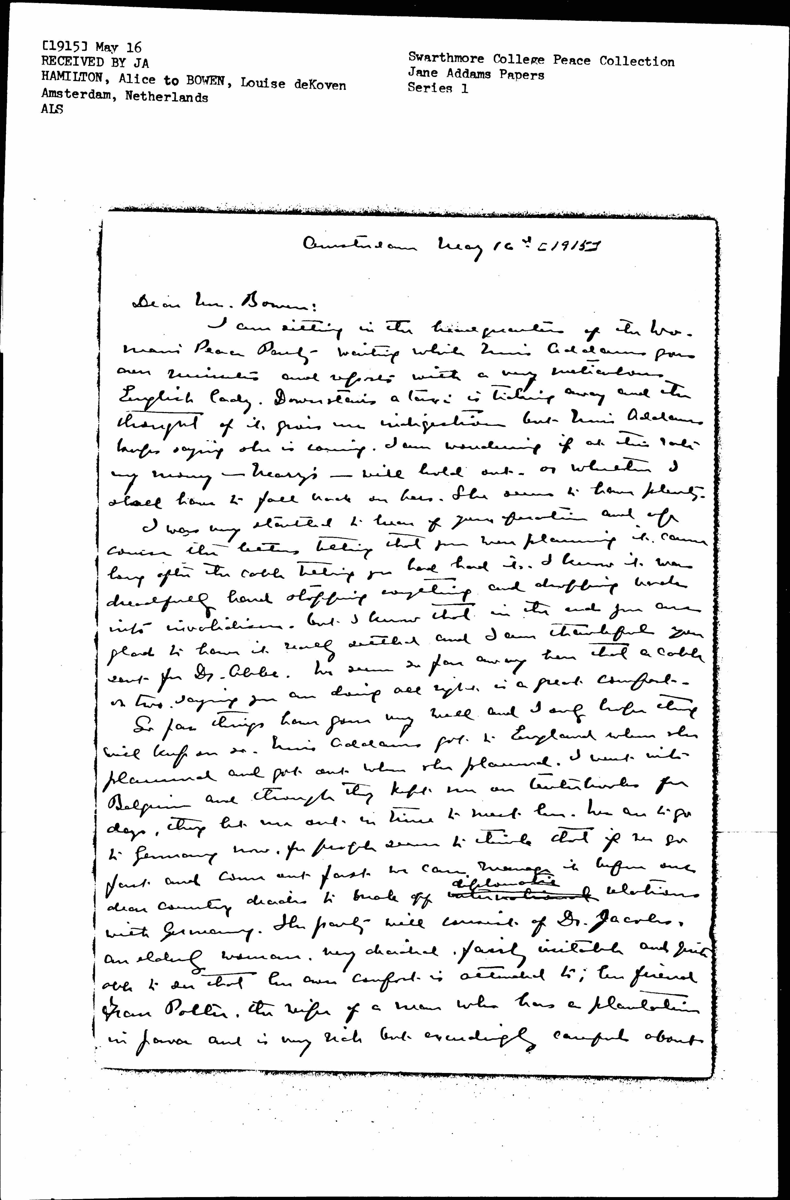 So far things have gone very well and I only hope they will keep on so. Miss Addams got to England when she planned and got out when she planned. I went into Belgium and though they kept me on tenterhooks for days, they let me out in time to meet her. We are to go to Germany now, for people seem to think that if we go fast and come out fast we can manage it before our dear country decides to break off international <diplomatic> relations with Germany. The party will consist of Dr. Jacobs, an elderly woman, very decided, fairly irritable and quite able to see that her own comfort is attended to; her friend Frau [Palthe], the wife of a man who has a plantation in Java and is very rich but exceedingly careful about [page 2] pennies, also elderly; and J. A. and myself. It will not be bad, for a party of two couples makes up easily into twos.