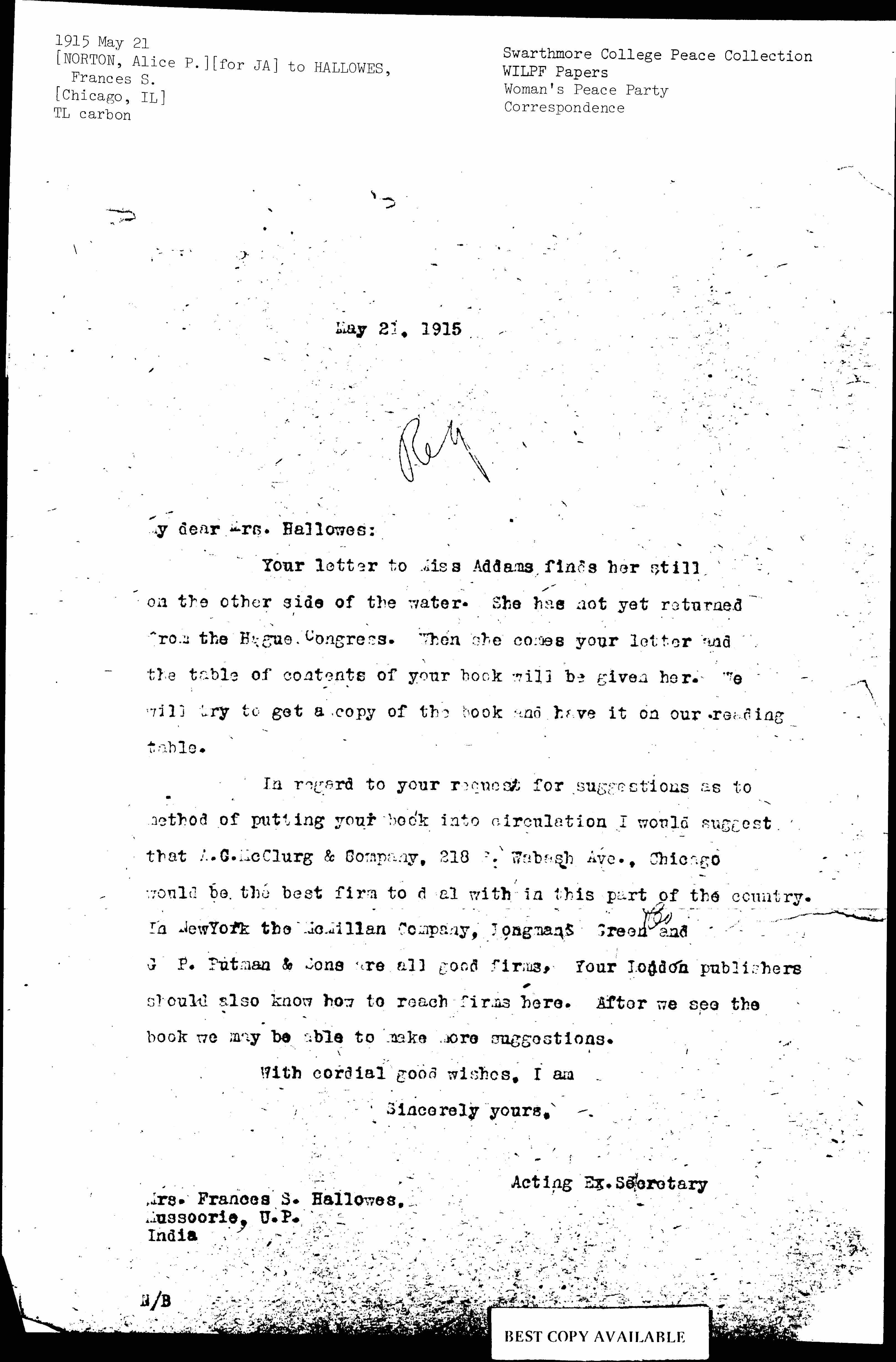 In regard to your request for suggestions as to method of putting your book into circulation I would suggest that A. G. McClurg & Company, 218 [S]. Wabash Ave., Chicago would be the best firm to deal with in this part of the country. In New York the [Macmillan] Company, [Longman] Green <& Co> and G. P. Putnam & Sons are all good firms. Your London publishers should also know how to reach firms here. After we see the book we may be able to make more suggestions.