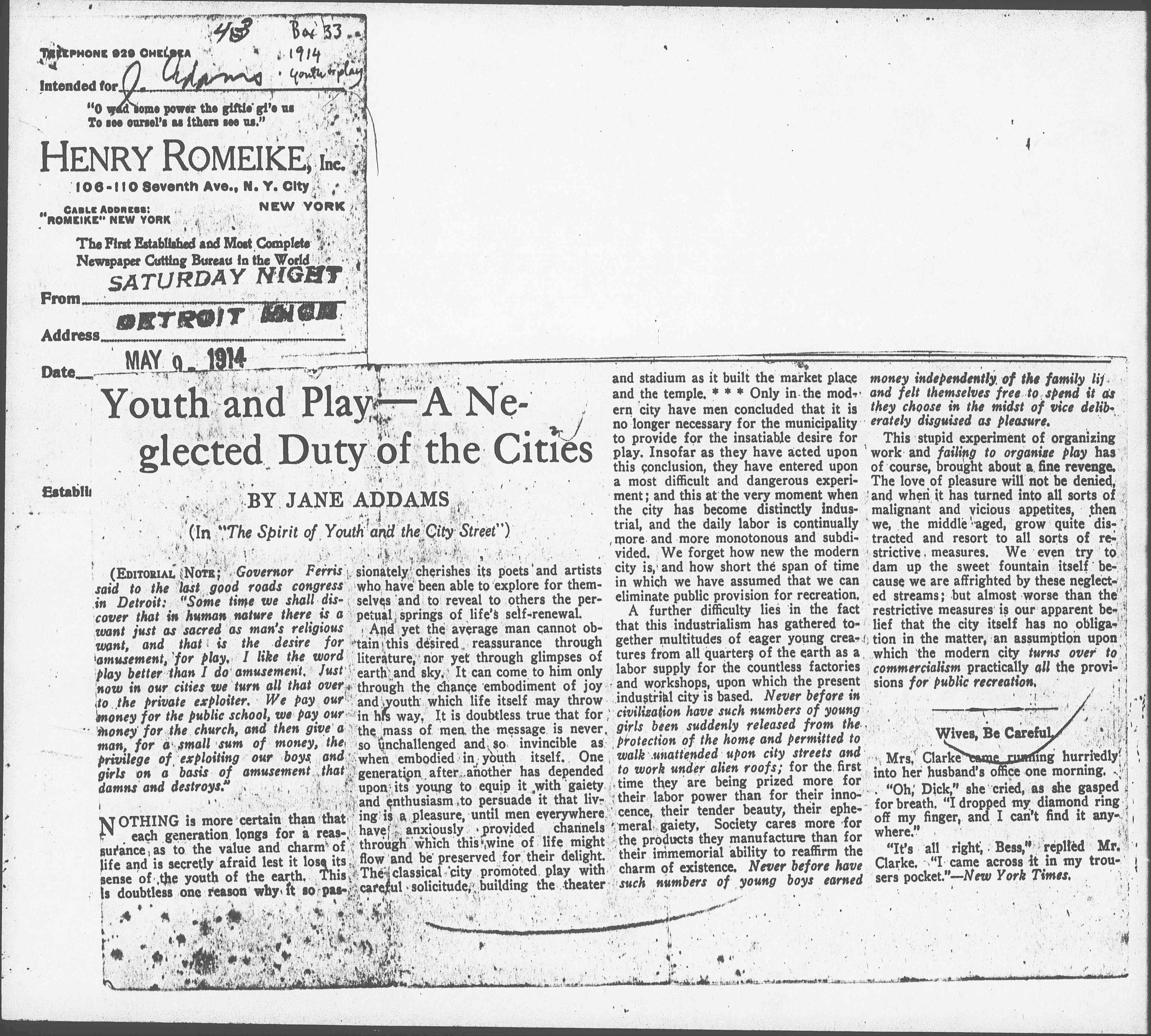 This stupid experiment of organizing work and failing to organize play has of course, brought about a fine revenge. The love of pleasure will not be denied, and when it has turned into all sorts of malignant and vicious appetites, then we, the middle aged, grow quite distracted and resort to all sorts of restrictive measures. We even try to dam up the sweet fountain itself because we are affrighted by these neglected streams; but almost worse than the restrictive measures is our apparent belief that the city itself has no obligation in the matter, an assumption upon which the modern city turns over to commercialism practically all the provisions for public recreation.