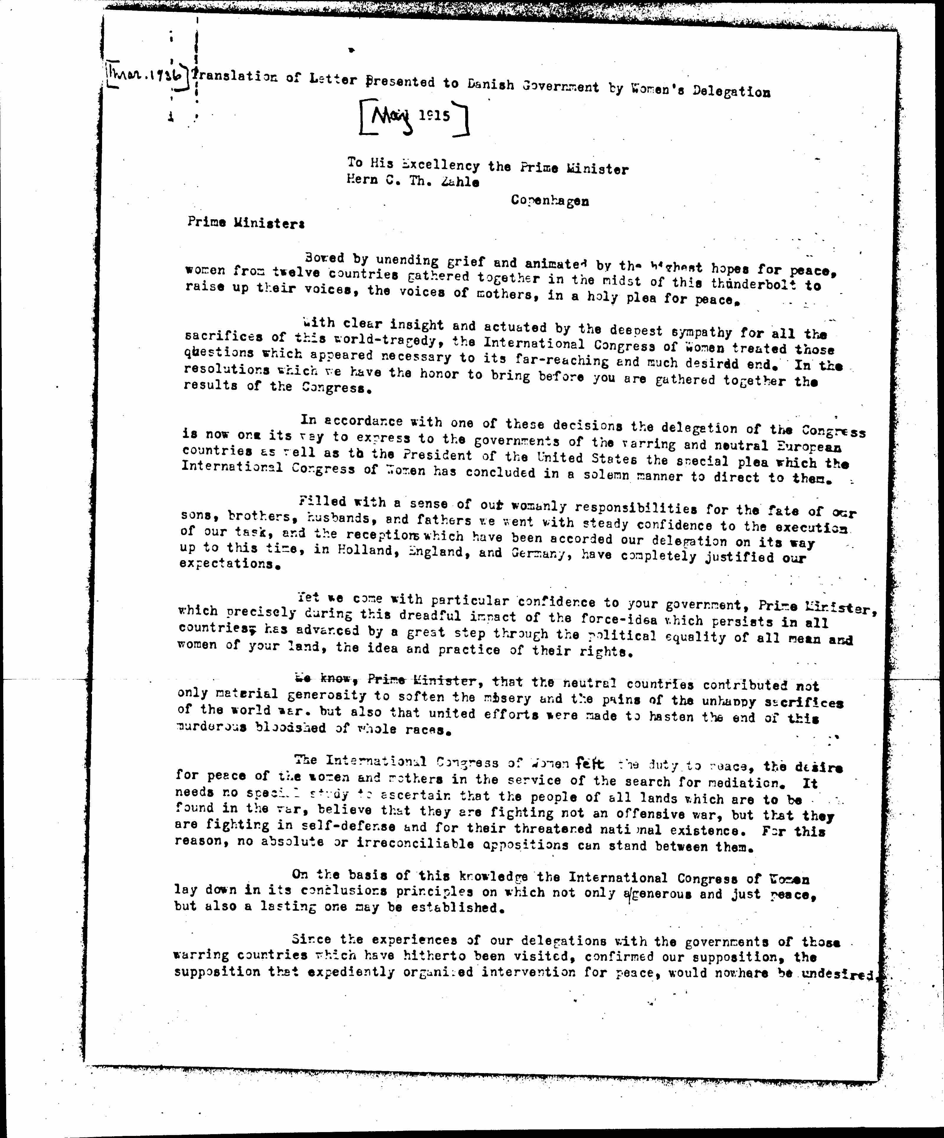 Translation of Letter Presented to Danish Government by Women's Delegation