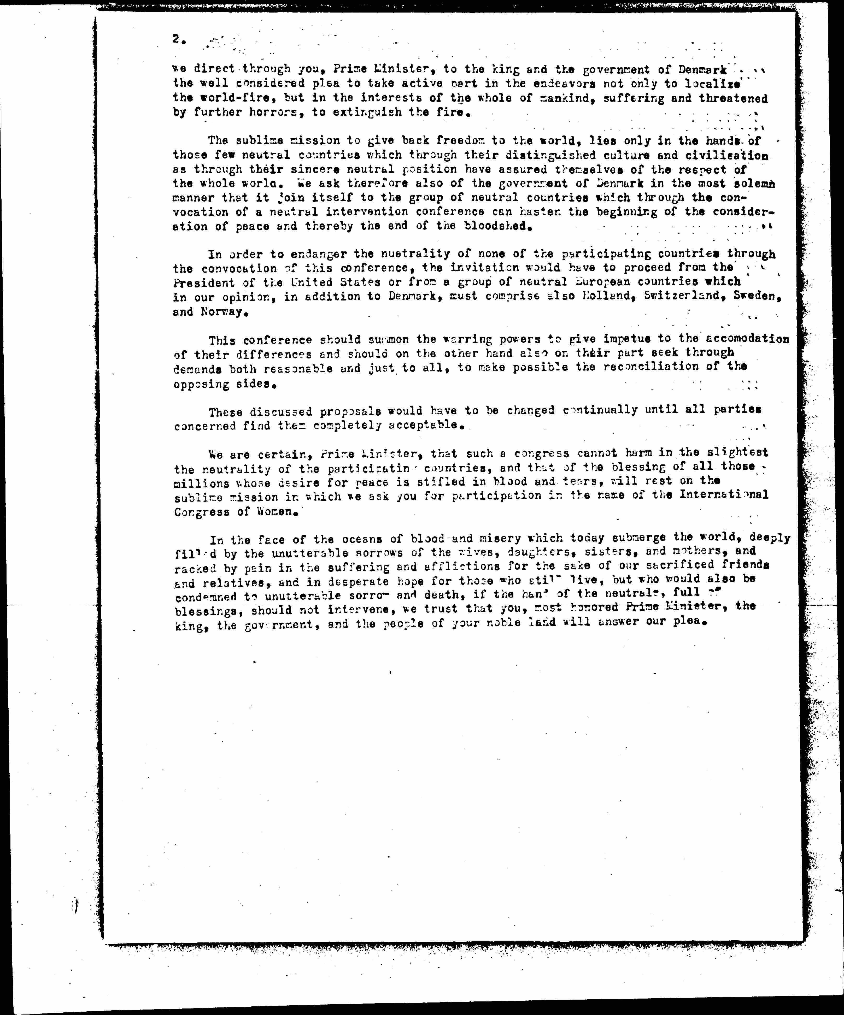 Since the experiences of our delegations with the governments of those warring countries which have hitherto been visited, confirmed our supposition, the supposition that expediently organized intervention for peace, would nowhere be undesired, [page 2] we direct through you, Prime Minister, to the king and the government of Denmark the well considered plea to take active part in the endeavors not only to localize the world-fire, but in the interests of the whole of mankind, suffering and threatened by further horrors, to extinguish the fire.