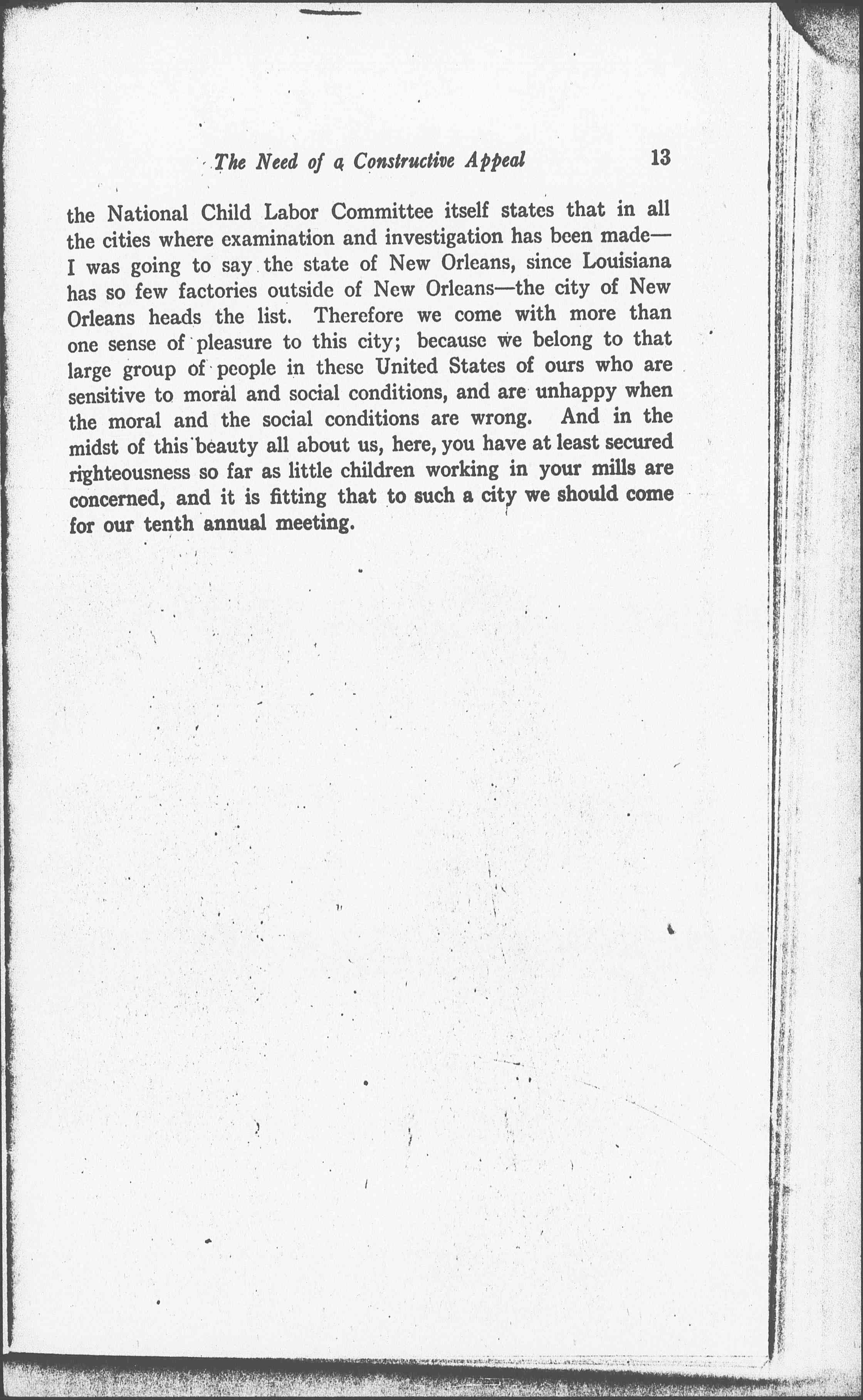I want to congratulate you that visitors may come to New Orleans to enjoy all that you have to offer without having a bad conscience about the mills. Sometimes one goes to a southern city and is almost afraid to look down the street, because at the end of it will be a large and flourishing cotton factory within which are numbers of little children, and you wish that you had not come to this particular southern city to spend your winter vacation. Your vacation is destroyed because you are haunted by the thought of those little children within a few blocks of your hotel grinding away all day far into the night. But one can come to New Orleans with a clear conscience. One can drive up and down its beautiful streets and look at its old houses without fear or favor; because a recent report made by [page 3] the National Child Labor Committee itself states that in all the cites where examination and investigation has been made -- I was going to say the state of New Orleans, since Louisiana has so few factories outside of New Orleans -- the city of New Orleans heads the list. Therefore we come with more than one sense of pleasure to this city; because we belong to that large group of people in these United States of ours who are sensitive to moral and social conditions, and are unhappy when the moral and the social conditions are wrong. And in the midst of this beauty all about us, here, you have at least secured righteousness so far as little children working in your mills are concerned, and it is fitting that to such a city we should come for our tenth annual meeting.