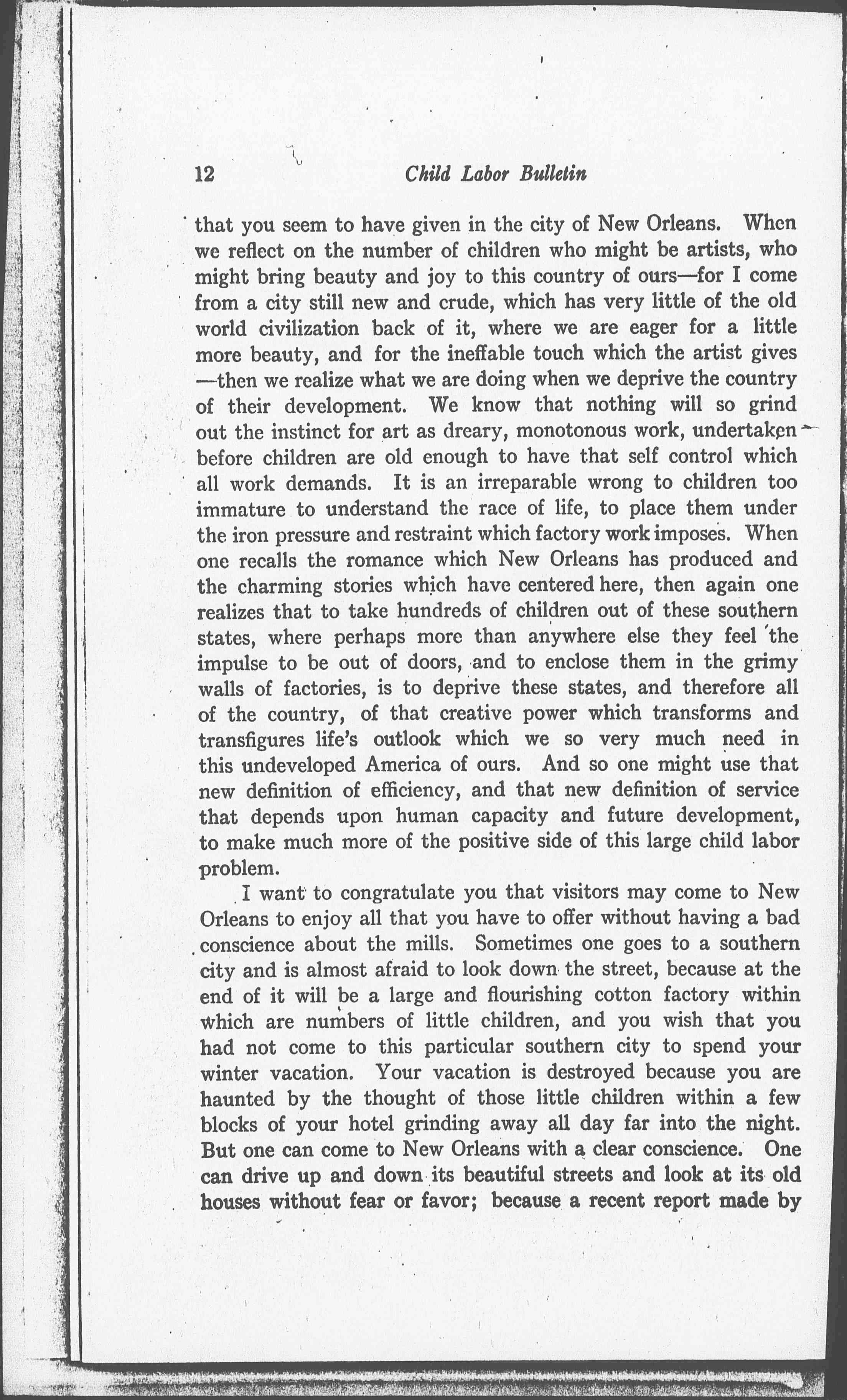 I never come to New Orleans without going to see your beautiful pottery, and I never see those charming designs which are made in your Sophie Newcomb College without wondering why it is that we do not have more artistic centers in these United States. There is clay everywhere which might be wrought into beautiful shapes. Surely there are young people of ability and susceptibility who might be trained everywhere, did we but have the people to give the attention and the care to them [page 2] that you seem to have given in the city of New Orleans. When we reflect on the number of children who might be artists, who might bring beauty and joy to this country of ours -- for I come from a city still new and crude, which has very little of the old world civilization back of it, where we are eager for a little more beauty, and for the ineffable touch which the artist gives -- then we realize what we are doing when we deprive the country of their development. We know that nothing will so grind out the instinct for art as dreary, monotonous work, undertaken before children are old enough to have that self control which all work demands. It is an irreparable wrong to children too immature to understand the race of life, to place them under the iron pressure and restraint which factory work imposes. When one recalls the romance which New Orleans has produced and the charming stories which have centered here, then again one realizes that to take hundreds of children out of these southern states, where perhaps more than anywhere else they feel the impulse to be out of doors, and to enclose them in the grimy walls of factories, is to deprive these states, and therefore all of the country, of that creative power which transforms and transfigures life's outlook which we so very much need in this undeveloped America of ours. And so one might use that new definition of efficiency, and that new definition of service that depends upon human capacity and future development, to make much more of the positive side of this large child labor problem.