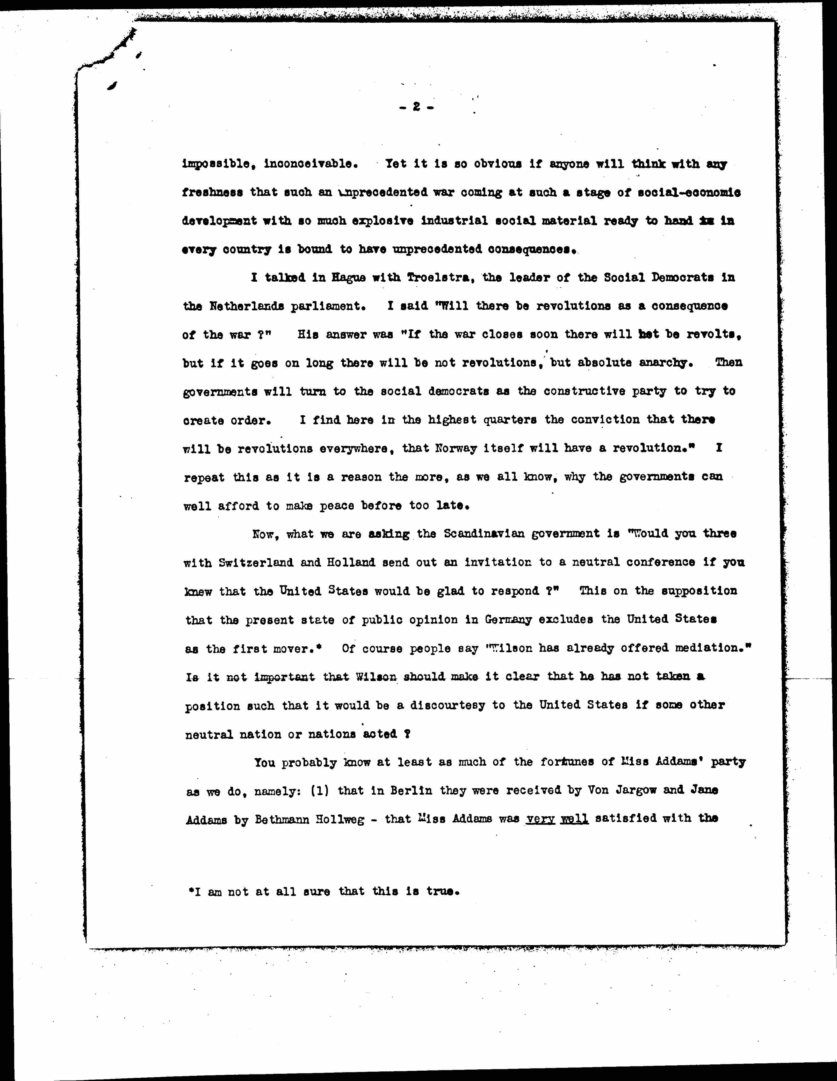 I talked in Hague with Troelstra, the leader of the Social Democrats in the Netherlands parliament. I said "Will there be revolutions as a consequence of the war?" His answer was "If the war closes soon there will not be revolts, but if it goes on long there will be not revolutions, but absolute anarchy. Then governments will turn to the social democrats as the constructive party to try to create order. I find here in the highest quarters the conviction that there will be revolutions everywhere, that Norway itself will have a revolution." I repeat this as it is a reason the more, as we all know, why the governments can well afford to make peace before too late.